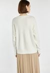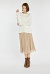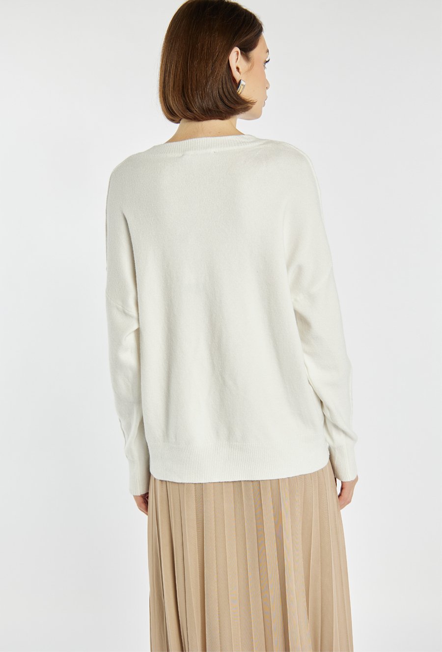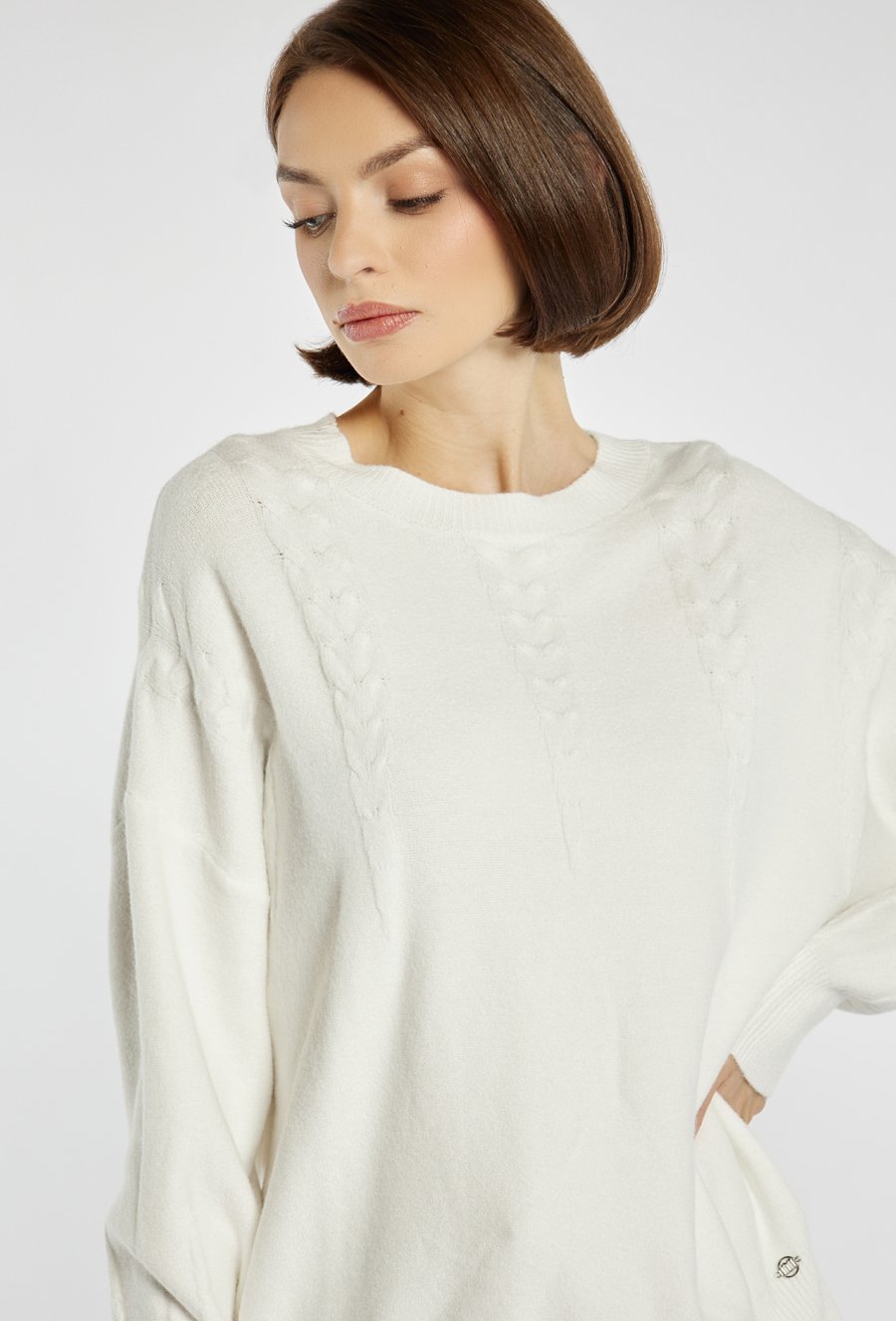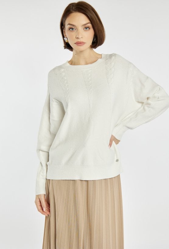 Sweter damski o klasycznym kroju z subtelnym wzorem na przodzie i rękawach. Miękka dzianina zapewnia komfort noszenia, a delikatne detale dodają mu elegancji. Idealny do codziennych stylizacji, zarówno w zestawieniu ze spodniami, jak i spódnicą. Modelka na zdjęciu ma 177 cm wzrostu i prezentuje rozmiar S/M.