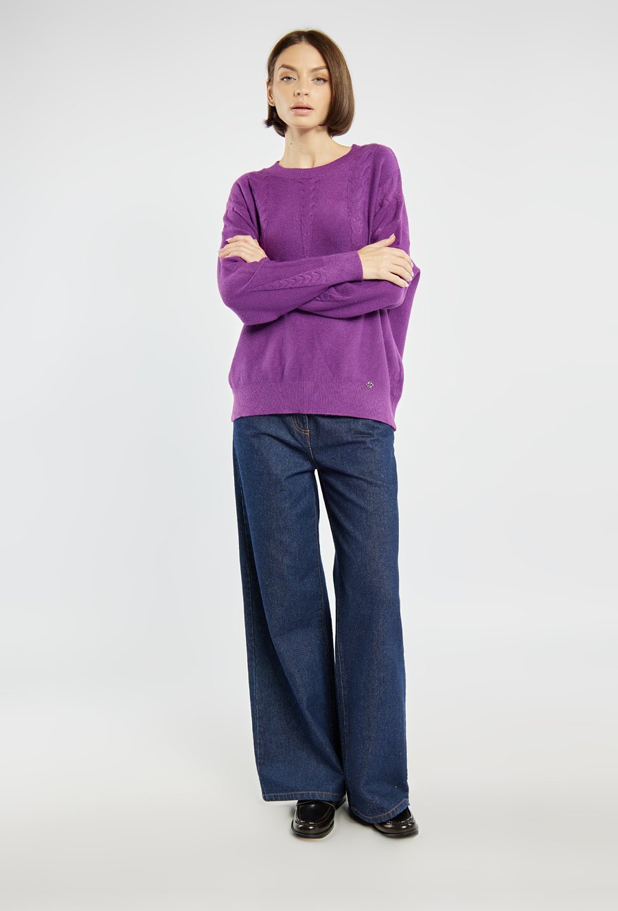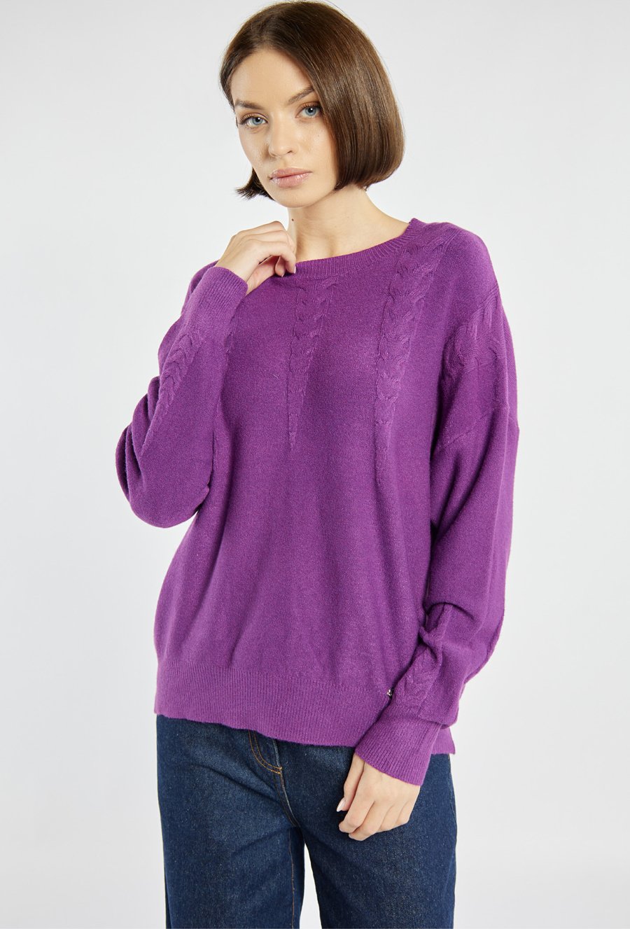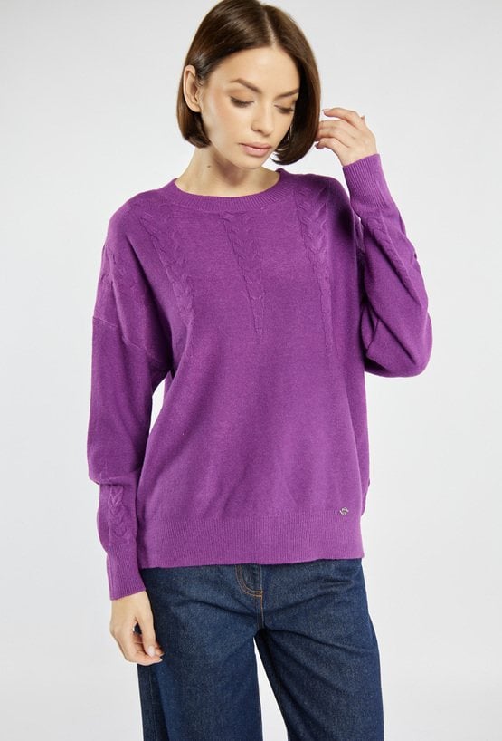 Sweter damski o klasycznym kroju z subtelnym wzorem na przodzie i rękawach. Miękka dzianina zapewnia komfort noszenia, a delikatne detale dodają mu elegancji. Idealny do codziennych stylizacji, zarówno w zestawieniu ze spodniami, jak i spódnicą. Modelka na zdjęciu ma 177 cm wzrostu i prezentuje rozmiar S/M.