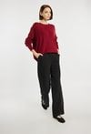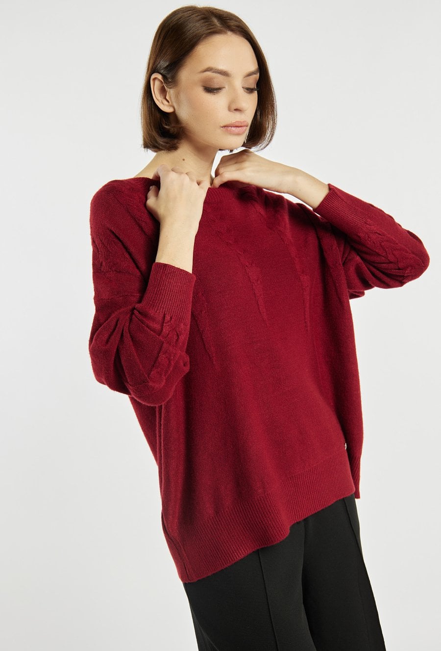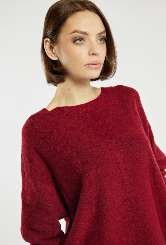 Sweter damski o klasycznym kroju z subtelnym wzorem na przodzie i rękawach. Miękka dzianina zapewnia komfort noszenia, a delikatne detale dodają mu elegancji. Idealny do codziennych stylizacji, zarówno w zestawieniu ze spodniami, jak i spódnicą. Modelka na zdjęciu ma 177 cm wzrostu i prezentuje rozmiar S/M.