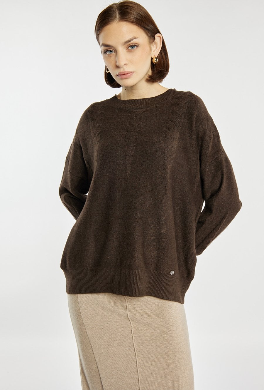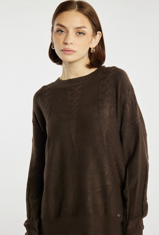 Sweter damski o klasycznym kroju z subtelnym wzorem na przodzie i rękawach. Miękka dzianina zapewnia komfort noszenia, a delikatne detale dodają mu elegancji. Idealny do codziennych stylizacji, zarówno w zestawieniu ze spodniami, jak i spódnicą. Modelka na zdjęciu ma 177 cm wzrostu i prezentuje rozmiar S/M.