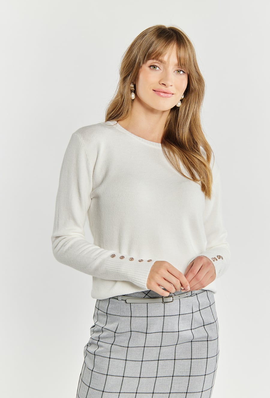 Sweter damski o prostym kroju z okrągłym dekoltem i długimi rękawami. Na mankietach znajdują się ozdobne, metalowe guziki, które dodają subtelnego akcentu. Dół swetra i mankiety wykończone są ściągaczami, co podkreśla klasyczny styl. Całość tworzy elegancką, a jednocześnie casualową propozycję, idealną na różne okazje. Modelka na zdjęciu ma 177 cm wzrostu i prezentuje rozmiar S/M.