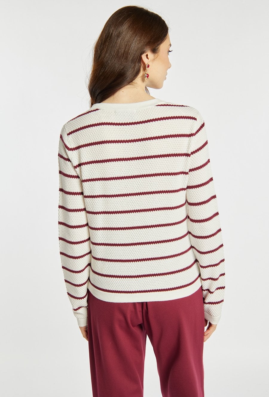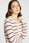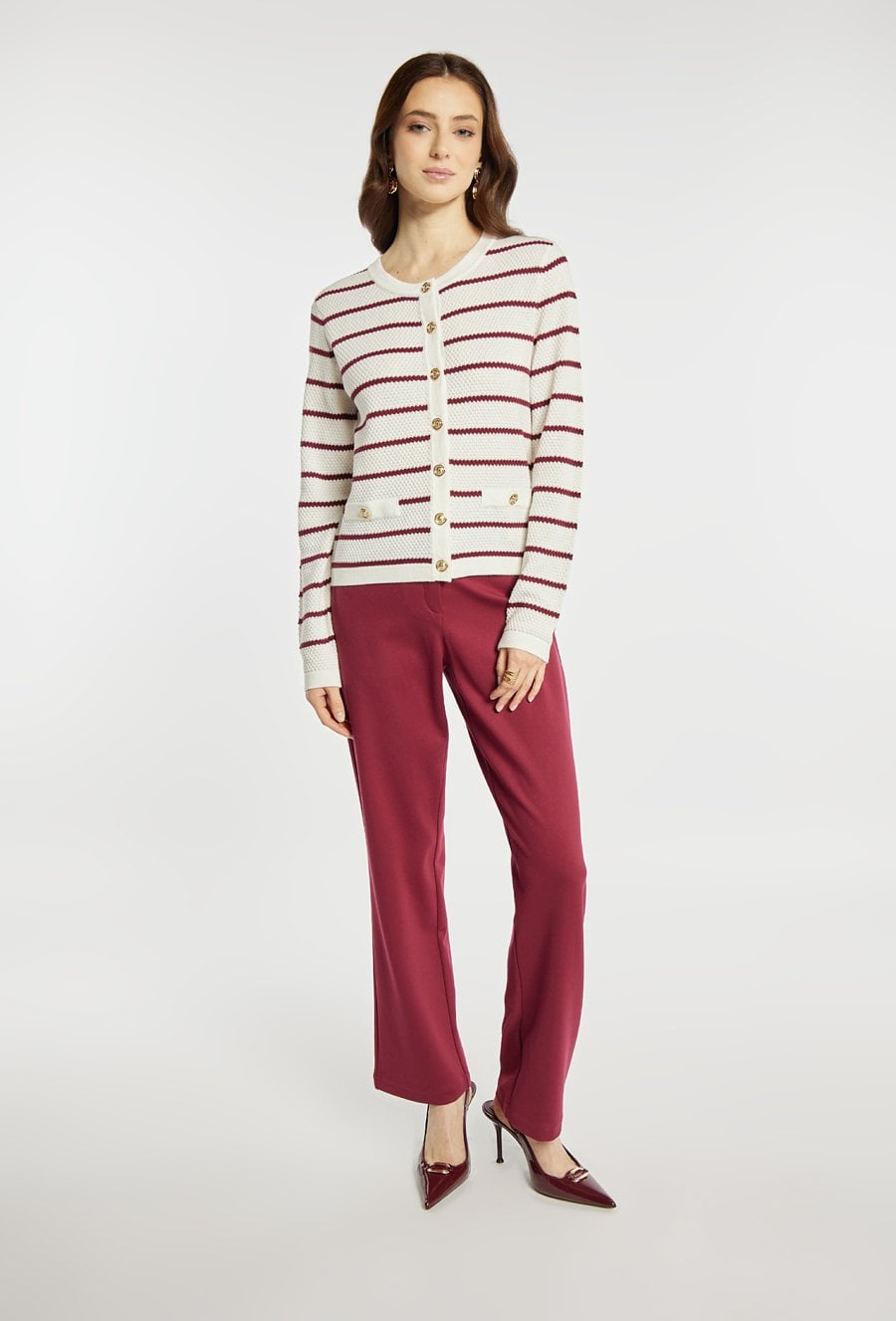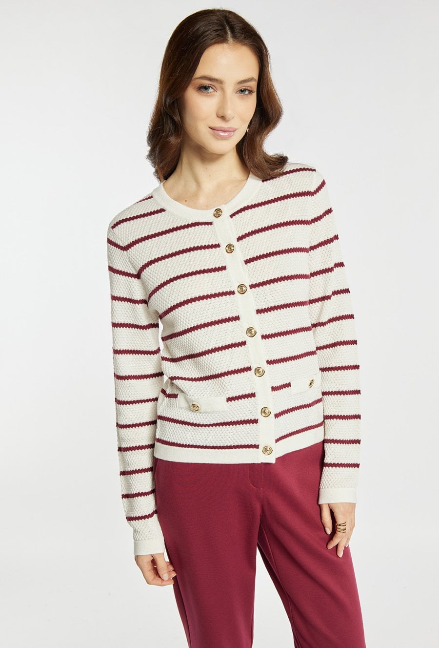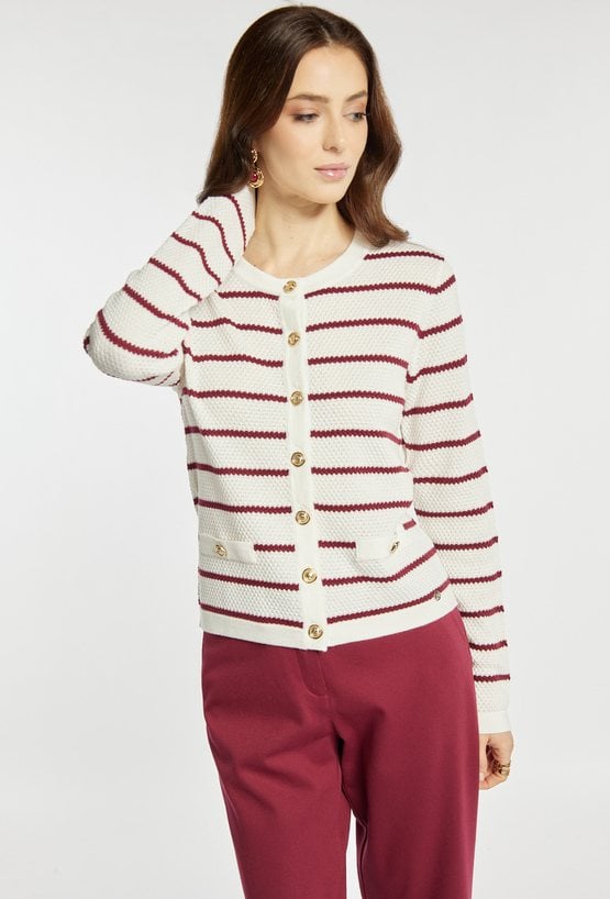 Sweter o klasycznym kroju zapinany na ozdobne guziki wyróżnia się eleganckim, paskowym wzorem. Model świetnie dopełnia codzienne i bardziej wyrafinowane stylizacje. Modelka na zdjęciu ma 177 cm wzrostu i prezentuje rozmiar S.