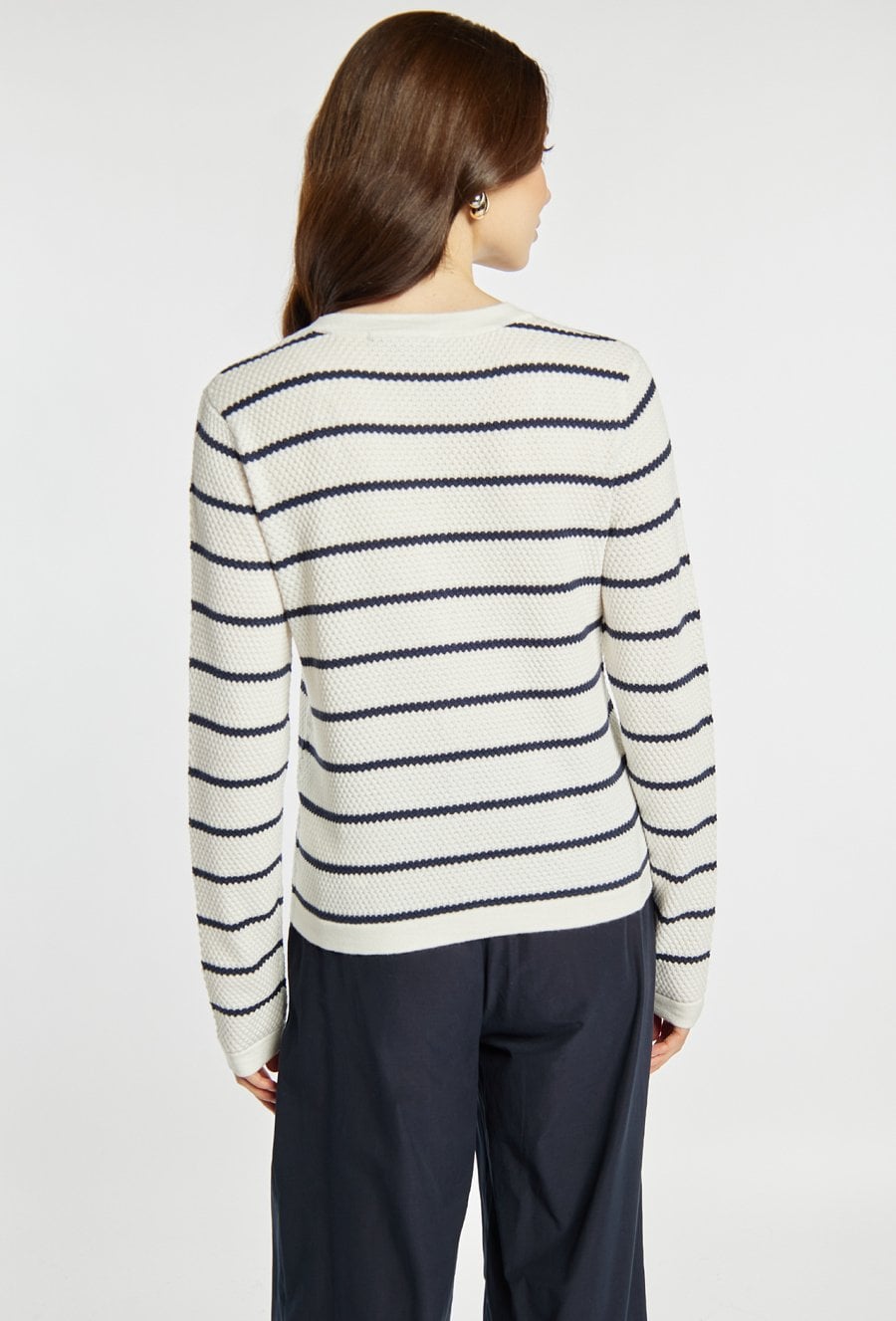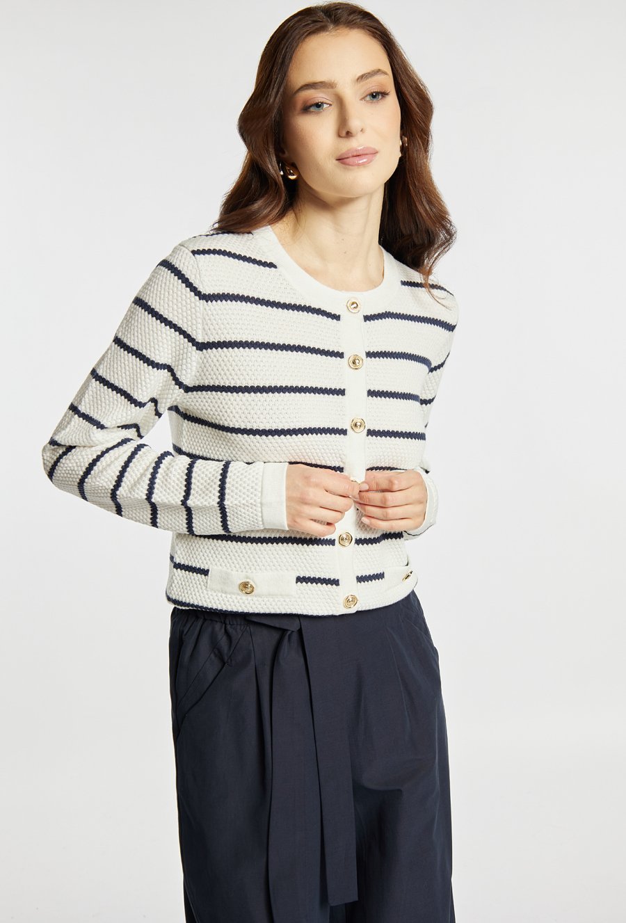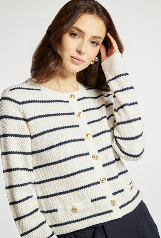 Sweter o klasycznym kroju zapinany na ozdobne guziki wyróżnia się eleganckim, paskowym wzorem. Model świetnie dopełnia codzienne i bardziej wyrafinowane stylizacje. Modelka na zdjęciu ma 177 cm wzrostu i prezentuje rozmiar S.