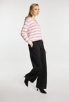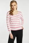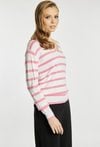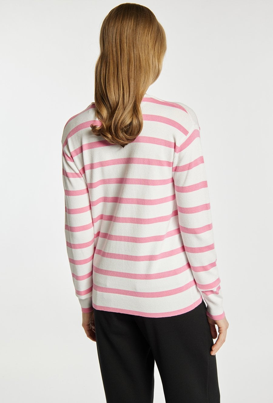 Sweter z dekoltem w serek i długim rękawem wyróżnia się pastelowym, paskowym wzorem, który nadaje stylizacji lekkiego i świeżego charakteru. Model idealny na co dzień oraz do wiosennych zestawów. Modelka na zdjęciu ma 177 cm wzrostu i prezentuje rozmiar S.