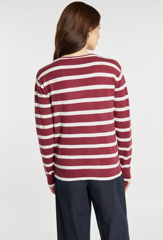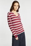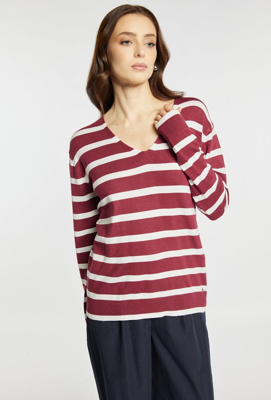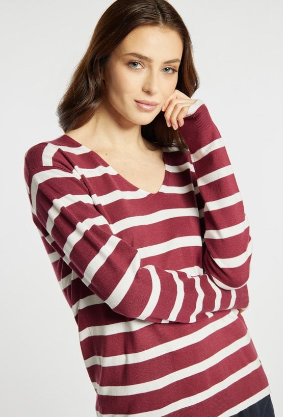 Sweter z dekoltem w serek i długim rękawem wyróżnia się pastelowym, paskowym wzorem, który nadaje stylizacji lekkiego i świeżego charakteru. Model idealny na co dzień oraz do wiosennych zestawów. Modelka na zdjęciu ma 177 cm wzrostu i prezentuje rozmiar S.