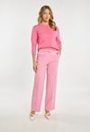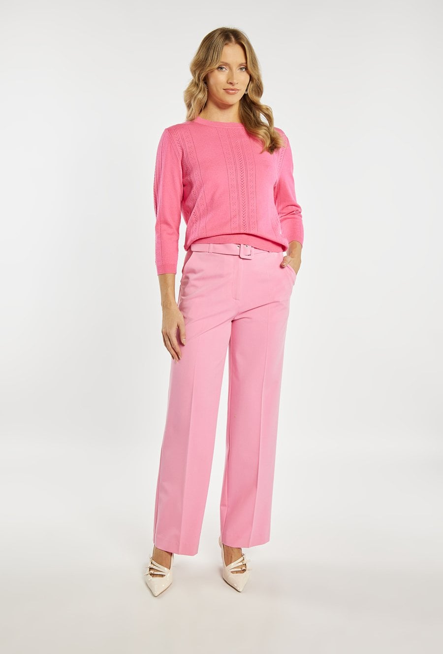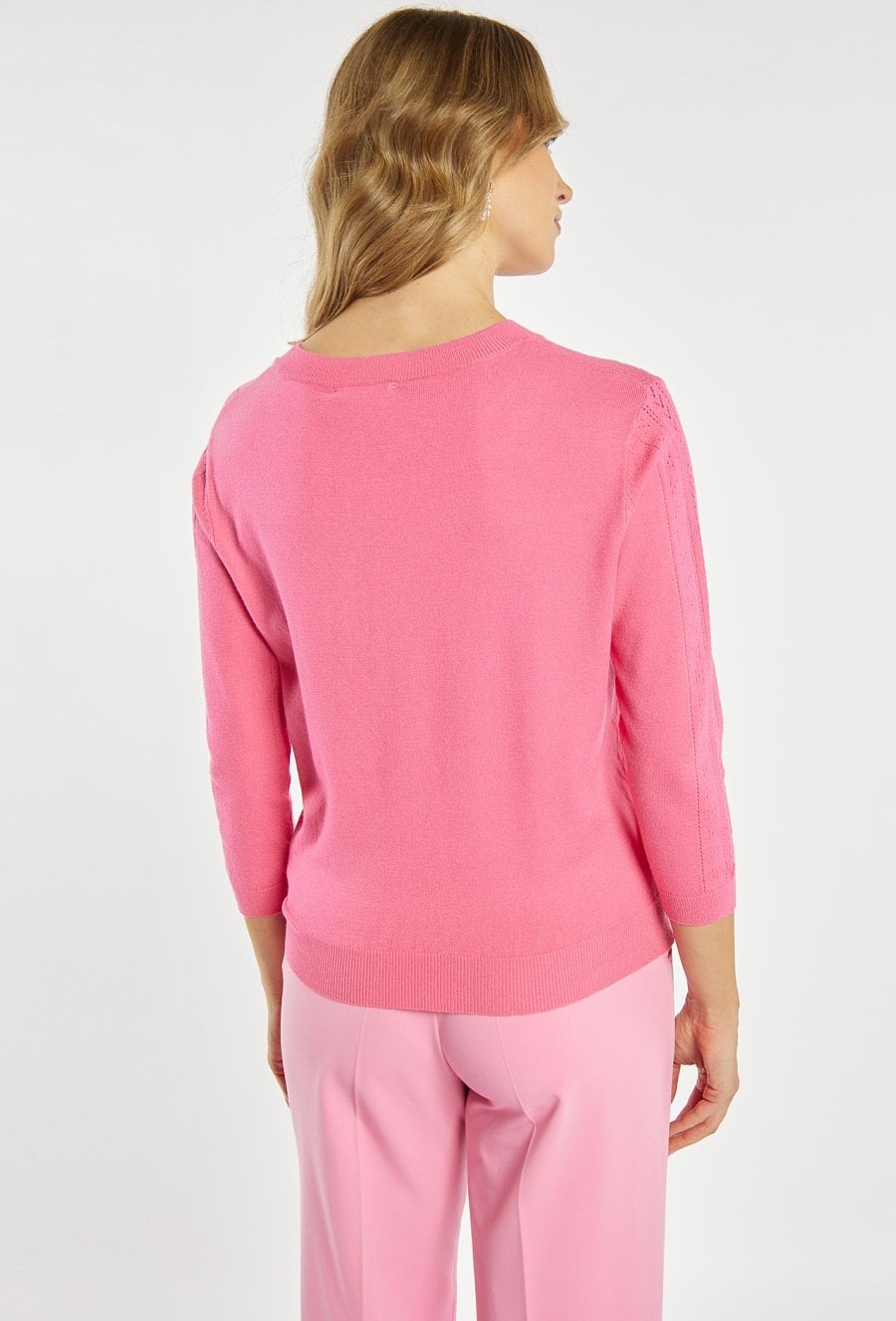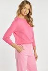 Sweter damski o klasycznym, eleganckim kroju. Model z długim rękawem oraz półokrągłym dekoltem. Przód zdobi subtelny, ażurowy wzór w pionowe pasy, który nadaje całości lekkości i kobiecego charakteru. Damski sweter doskonale sprawdzi się w codziennych oraz bardziej eleganckich stylizacjach. Modelka na zdjęciu ma 177 cm wzrostu i prezentuje rozmiar S/M.