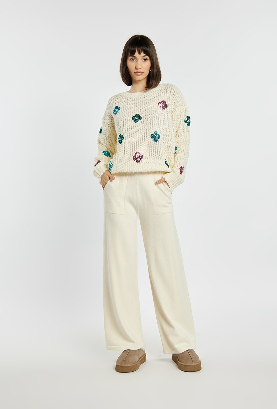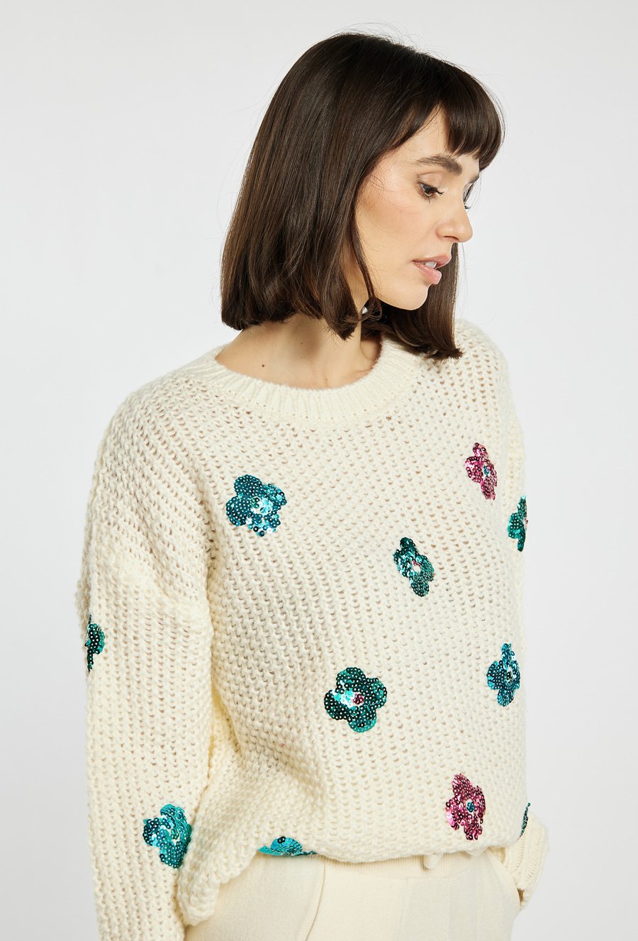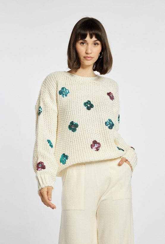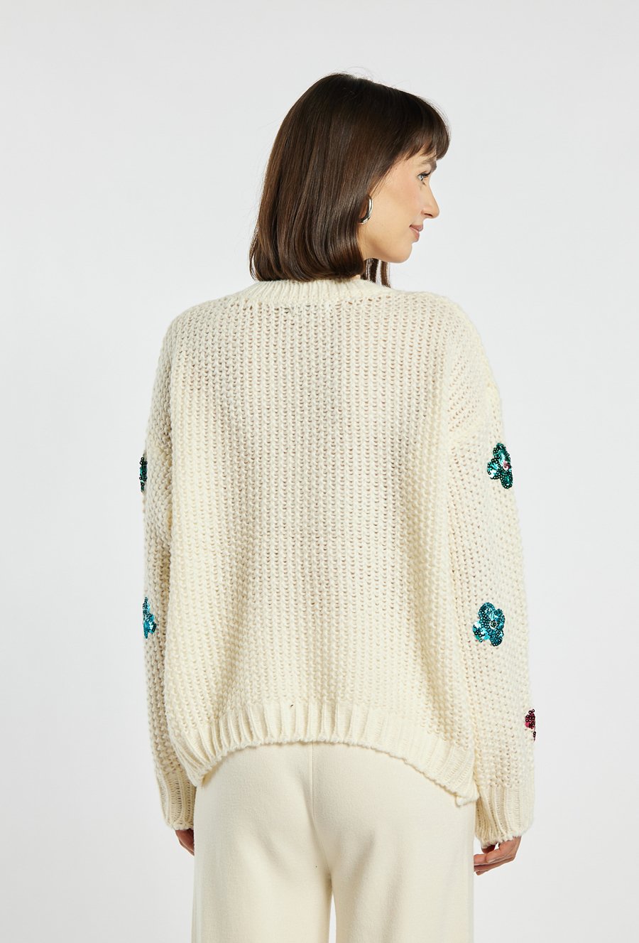 Sweter damski o grubym splocie z ozdobnymi kwiatami z cekinów. Sweter wyróżnia się luźnym fasonem z opuszczoną linią ramion i ściągaczami przy rękawach i dole, które nadają mu wygodny, codzienny charakter. Kolorowe aplikacje z cekinów ożywiają całość i dodają modowego pazura. Modelka na zdjęciu ma 177 cm wzrostu i prezentuje rozmiar S/M.