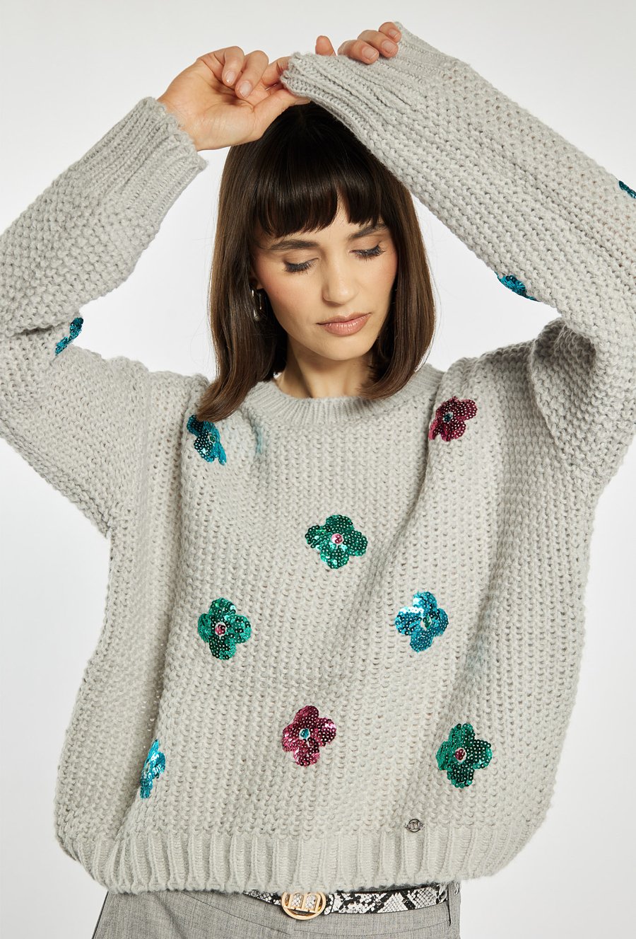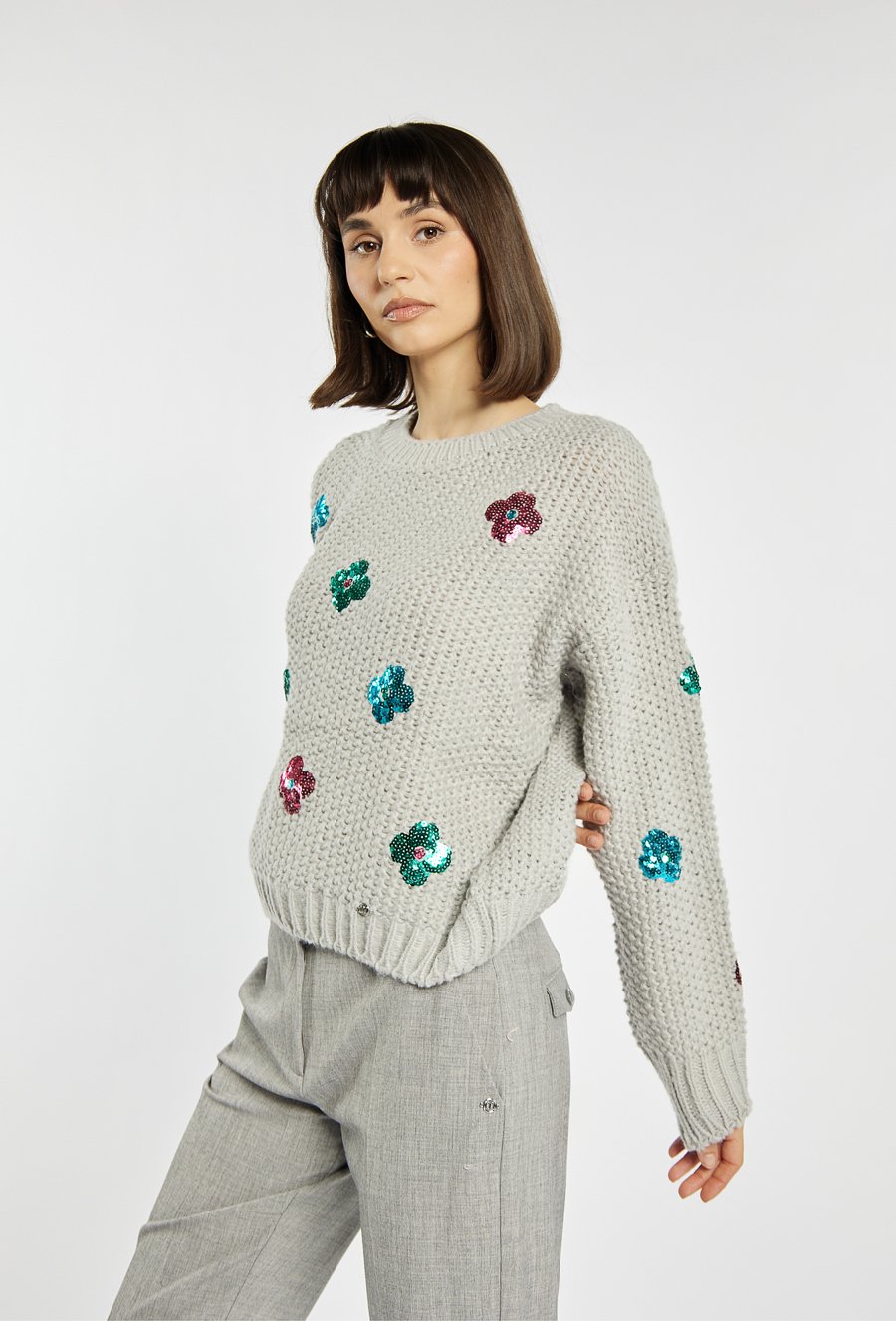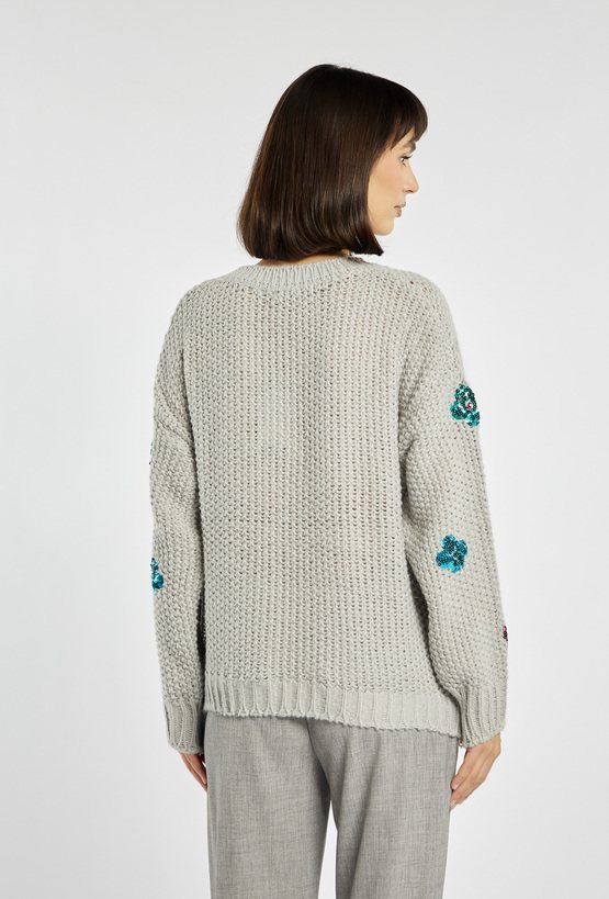 Sweter damski o grubym splocie z ozdobnymi kwiatami z cekinów. Sweter wyróżnia się luźnym fasonem z opuszczoną linią ramion i ściągaczami przy rękawach i dole, które nadają mu wygodny, codzienny charakter. Kolorowe aplikacje z cekinów ożywiają całość i dodają modowego pazura. Modelka na zdjęciu ma 177 cm wzrostu i prezentuje rozmiar S/M.