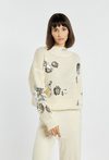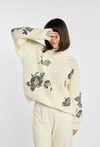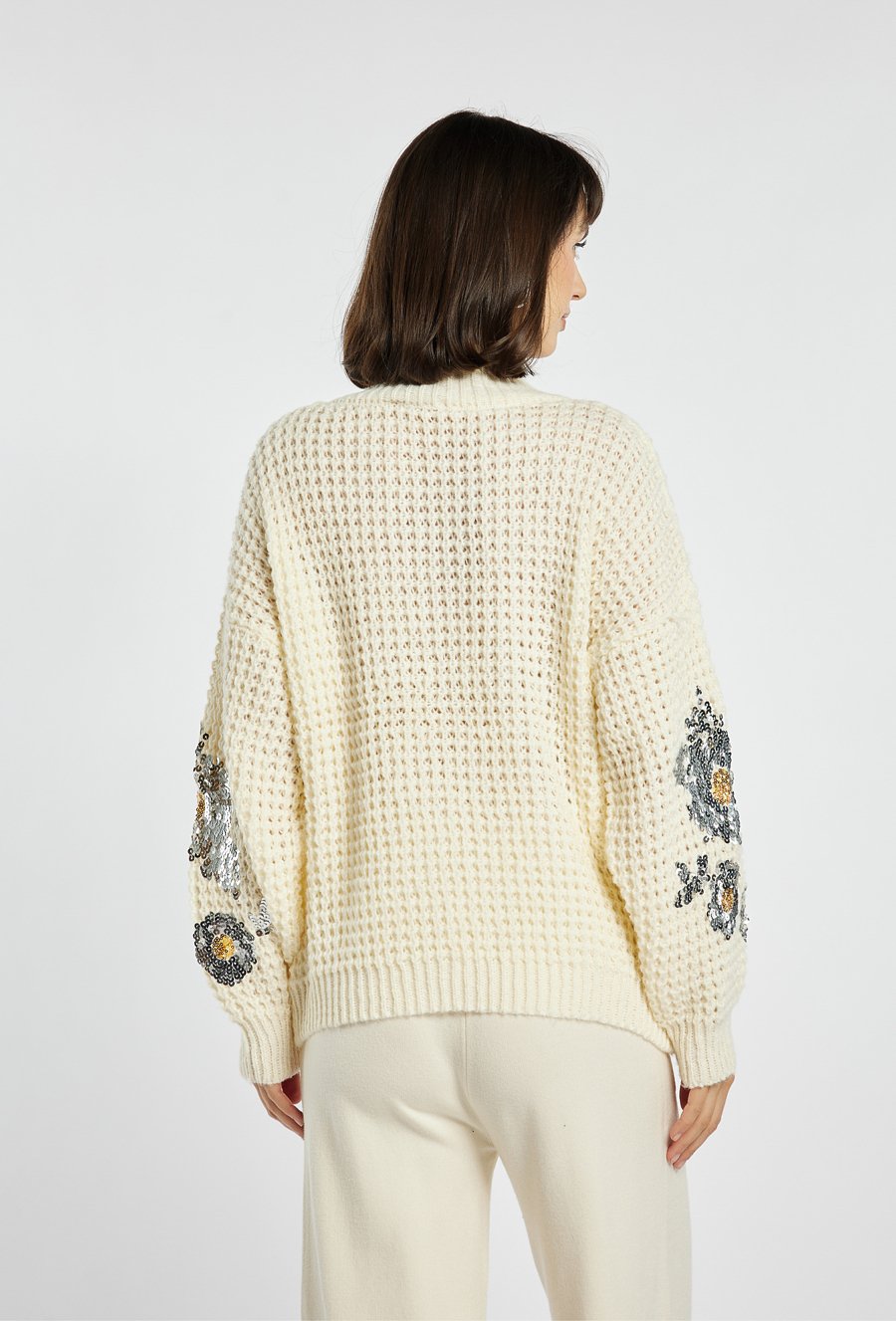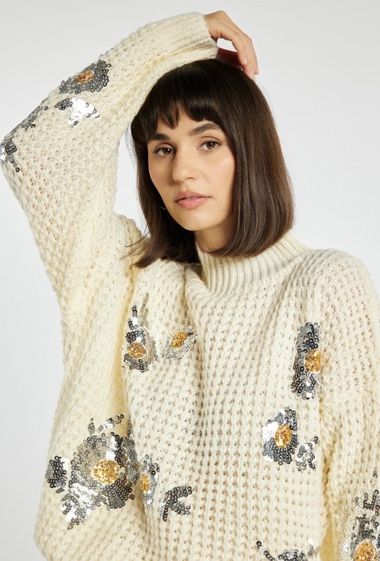 Sweter damski z grubym splotem i dekoracyjnymi cekinami w kształcie kwiatów. Sweter z delikatnie podniesionym kołnierzem i prostym krojem gwarantuje wygodę i swobodę ruchów. Lśniące aplikacje dodają stylizacji charakteru i przyciągają wzrok. Model występuje w kilku wariantach kolorystycznych. Modelka na zdjęciu ma 177 cm wzrostu i prezentuje rozmiar S/M.