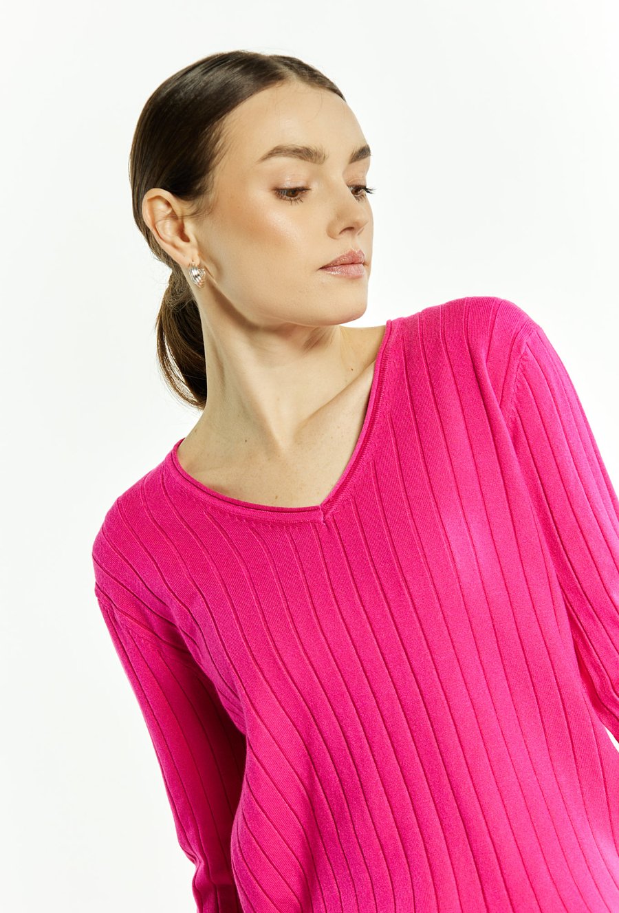 Prążkowany sweter damski z dodatkiem elastycznych włókien. Sweter z długimi rękawami oraz dekoltem w serek. Sweter ten występuję w wielu wariantach kolorystycznych. Model ten z pewnością sprawdzi się na co dzień. Modelka na zdjęciu ma 177 cm wzrostu i prezentuje rozmiar S/M.