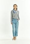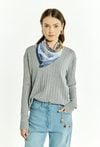 Prążkowany sweter damski z dodatkiem elastycznych włókien. Sweter z długimi rękawami oraz dekoltem w serek. Sweter ten występuję w wielu wariantach kolorystycznych. Model ten z pewnością sprawdzi się na co dzień. Modelka na zdjęciu ma 177 cm wzrostu i prezentuje rozmiar S/M.