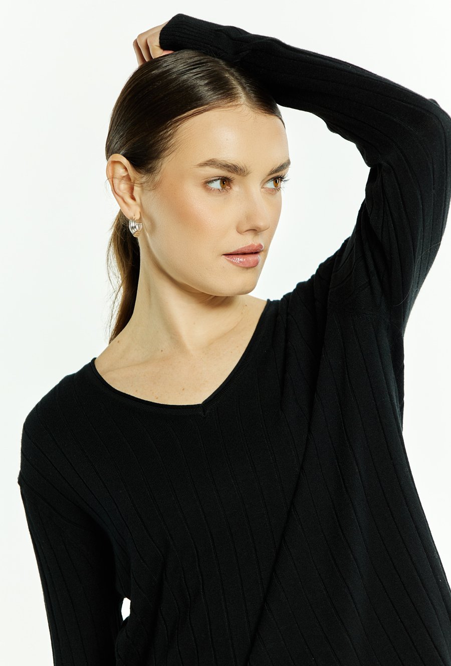 Prążkowany sweter damski z dodatkiem elastycznych włókien. Sweter z długimi rękawami oraz dekoltem w serek. Sweter ten występuję w wielu wariantach kolorystycznych. Model ten z pewnością sprawdzi się na co dzień. Modelka na zdjęciu ma 177 cm wzrostu i prezentuje rozmiar S/M.