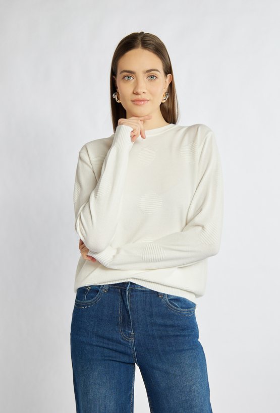 Sweter damski wykonany z przyjemnej wiskozy z dodatkiem elastycznych włókien. Sweter z długimi rękawami, półokrągłym dekoltem. Model wyróżnia się subtelnymi, strukturalnymi wzorami, dodającymi elegancji. Doskonały wybór na co dzień. Modelka na zdjęciu ma 177 cm wzrostu i prezentuje rozmiar S/M.