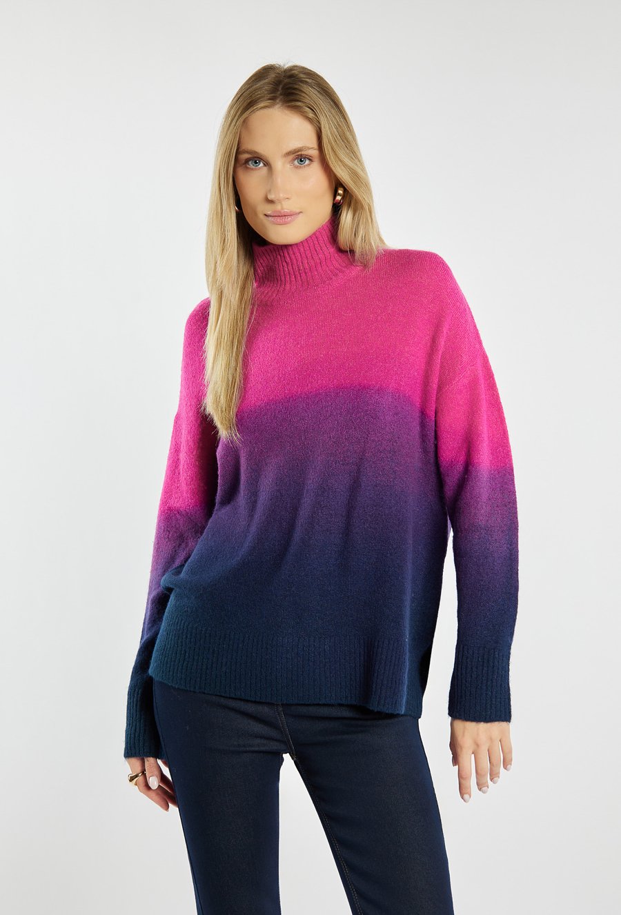 Sweter damski o luźnym kroju z półgolfem. Dół i rękawy wykończone szerokim ściągaczem nadają całości swobodny, a jednocześnie schludny wygląd. Doskonały wybór na chłodniejsze dni, idealnie komponuje się zarówno ze spodniami, jak i spódnicą. Modelka na zdjęciu ma 177 cm wzrostu i prezentuje rozmiar S.