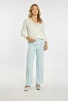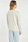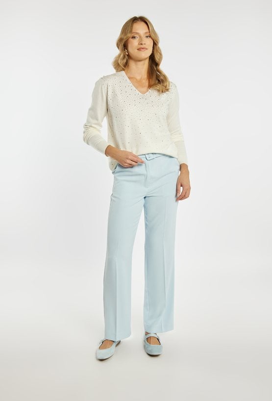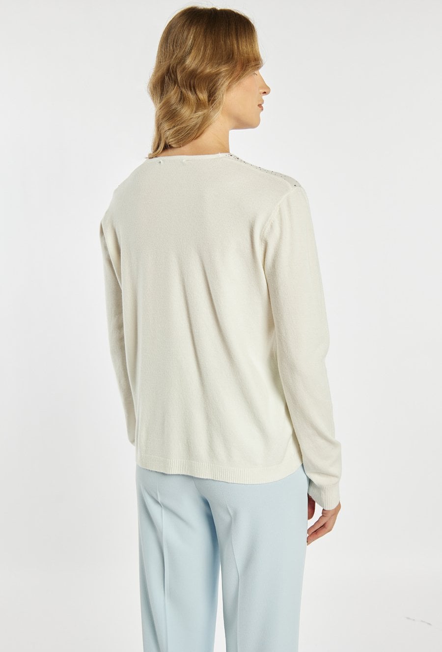 Sweter damski o swobodnym, eleganckim kroju. Model z długim rękawem oraz dekoltem w kształcie litery V, który subtelnie podkreśla linię szyi. Przód ozdobiony jest delikatnymi, połyskującymi zdobieniami w postaci drobnych dżetów. Modelka na zdjęciu ma 177 cm wzrostu i prezentuje rozmiar S/M.