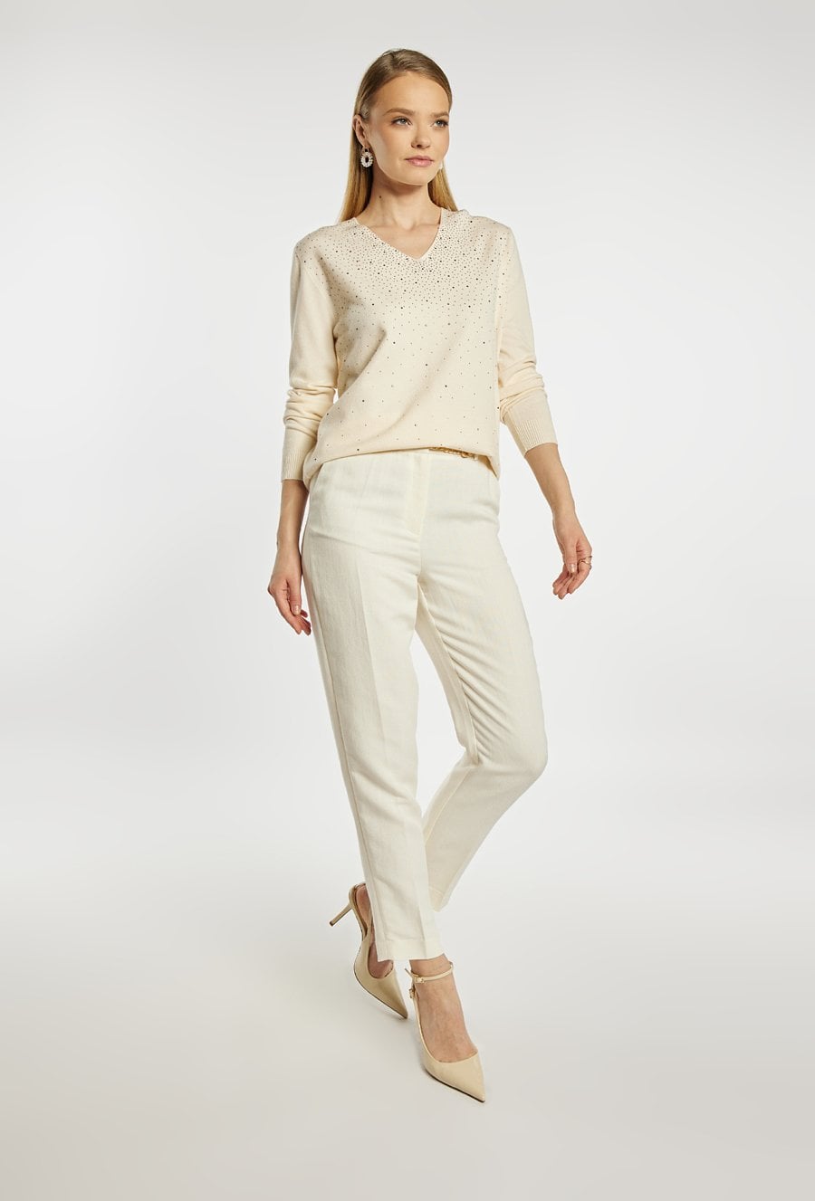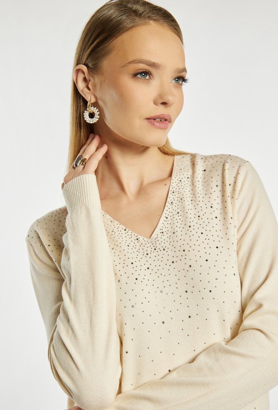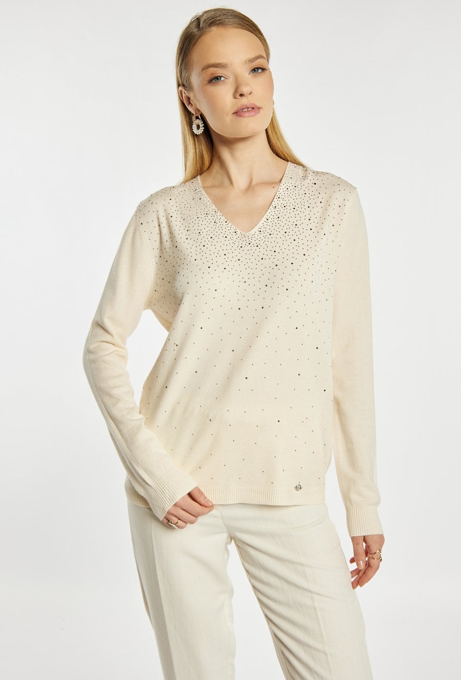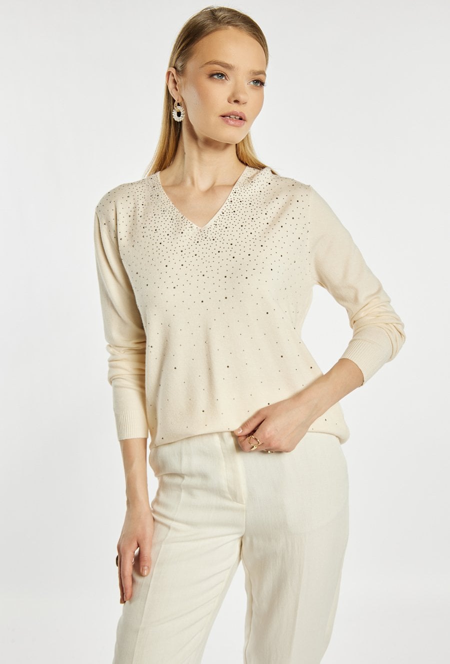 Sweter damski o swobodnym, eleganckim kroju. Model z długim rękawem oraz dekoltem w kształcie litery V, który subtelnie podkreśla linię szyi. Przód ozdobiony jest delikatnymi, połyskującymi zdobieniami w postaci drobnych dżetów. Modelka na zdjęciu ma 177 cm wzrostu i prezentuje rozmiar S/M.