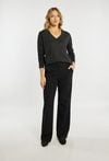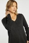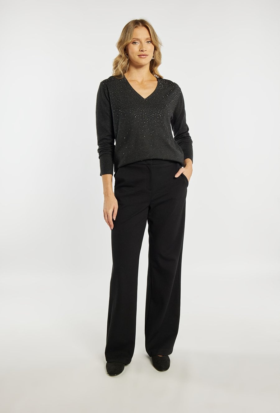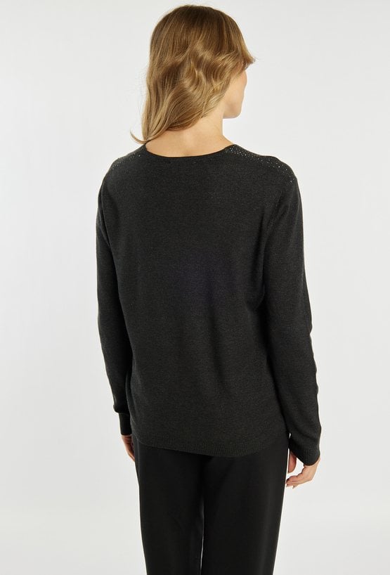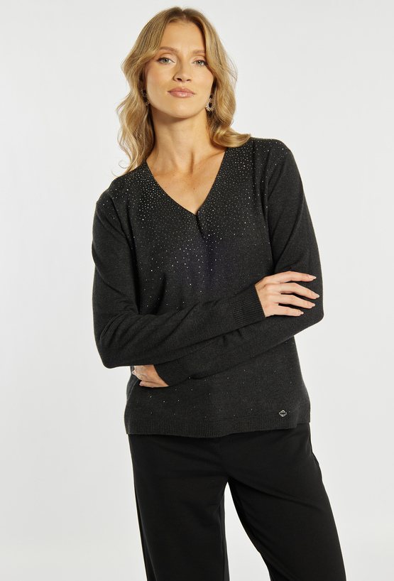 Sweter damski o swobodnym, eleganckim kroju. Model z długim rękawem oraz dekoltem w kształcie litery V, który subtelnie podkreśla linię szyi. Przód ozdobiony jest delikatnymi, połyskującymi zdobieniami w postaci drobnych dżetów. Modelka na zdjęciu ma 177 cm wzrostu i prezentuje rozmiar S/M.