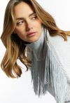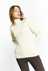 Sweter damski wykonany z przyjemnego materiału z domieszką wełny. Sweter z golfem, długimi rękawami oraz aplikacjami w postaci cienkich frędzli. Model ten świetnie sprawdzi się w chłodne dni. Modelka na zdjęciu ma 177 cm wzrostu i prezentuje rozmiar S.