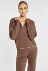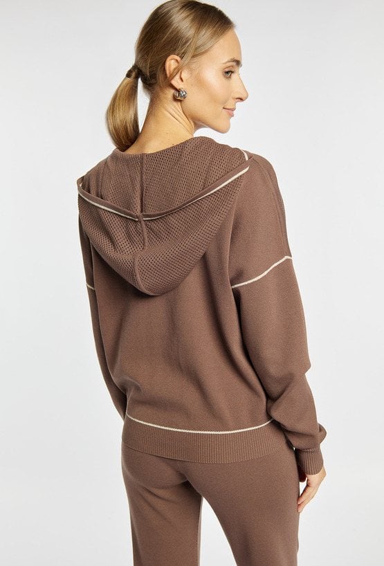 Sweter z długimi rękawami i kapturem to wygodny model w sportowym stylu, zapinany na suwak. Sweter ma luźny krój, delikatne kontrastowe przeszycia i przewiewny, ażurowy kaptur, który nadaje mu lekkości. Idealny do codziennych, komfortowych stylizacji. Polecamy zestawić z pasującym dołem. Kod do spodni: 26W-TRU0300. Modelka na zdjęciu ma 177 cm wzrostu i prezentuje rozmiar S.