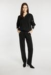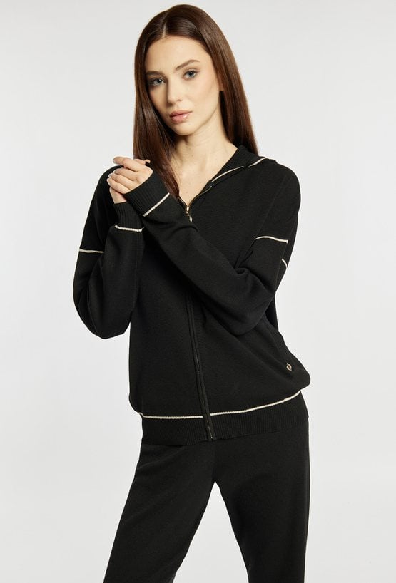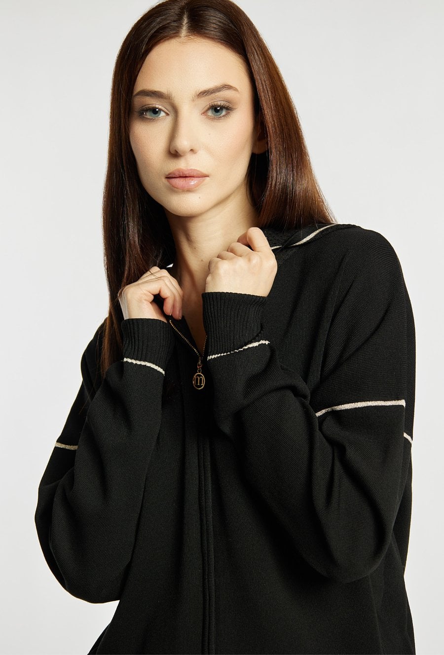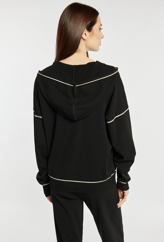 Sweter z długimi rękawami i kapturem to wygodny model w sportowym stylu, zapinany na suwak. Sweter ma luźny krój, delikatne kontrastowe przeszycia i przewiewny, ażurowy kaptur, który nadaje mu lekkości. Idealny do codziennych, komfortowych stylizacji. Polecamy zestawić z pasującym dołem. Kod do spodni: 26W-TRU0300. Modelka na zdjęciu ma 177 cm wzrostu i prezentuje rozmiar S.