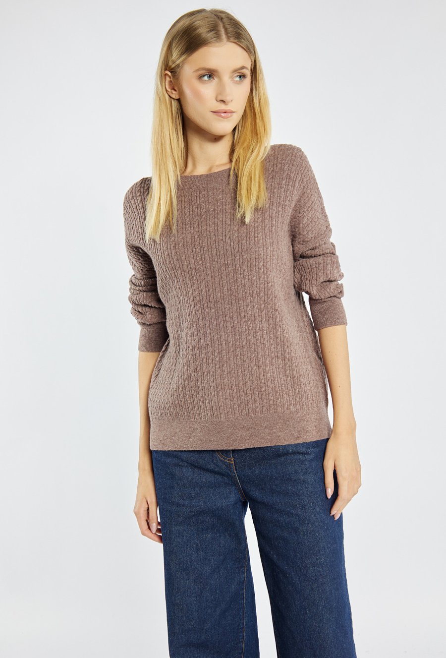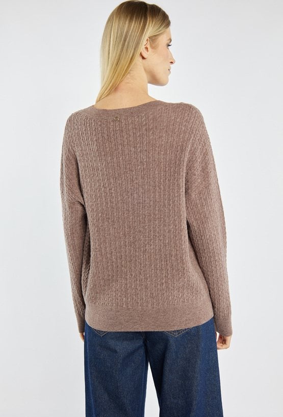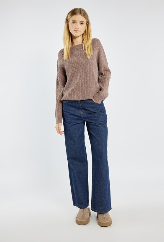 Sweter damski z dodatkiem kaszmiru. Sweter o warkoczowym splocie i klasycznym fasonie z okrągłym dekoltem. Model w granatowym kolorze doskonale sprawdzi się w jesienno-zimowych stylizacjach. Modelka na zdjęciu ma 177 cm wzrostu i prezentuje rozmiar S.