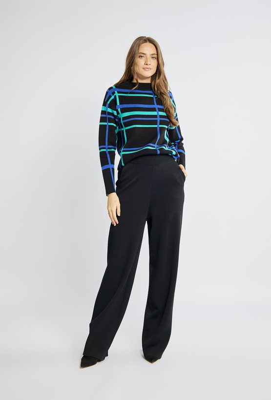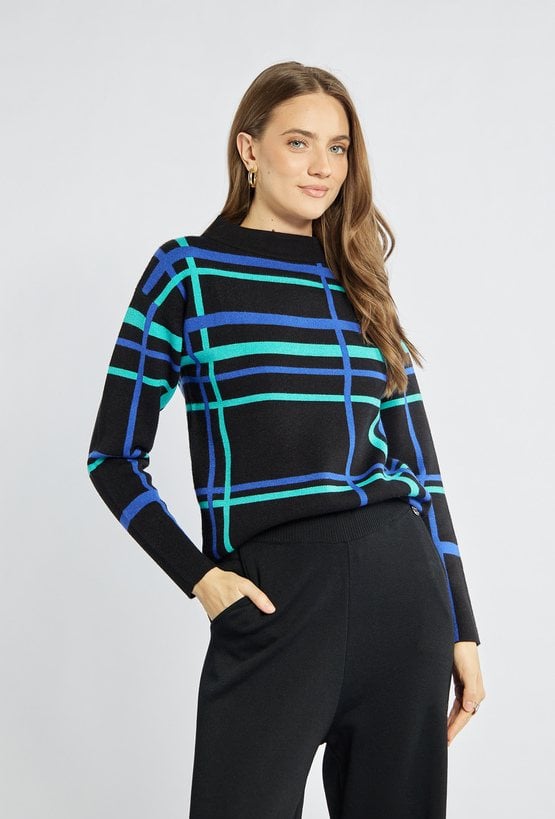 Sweter damski w efektowne, kolorowe paski to idealny wybór, aby dodać jesienno-zimowym stylizacjom wyrazistości. Sweter z długimi rękawami oraz półokrągłym dekoltem. Modelka na zdjęciu ma 177 cm wzrostu i prezentuje rozmiar S.