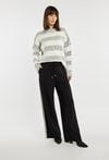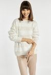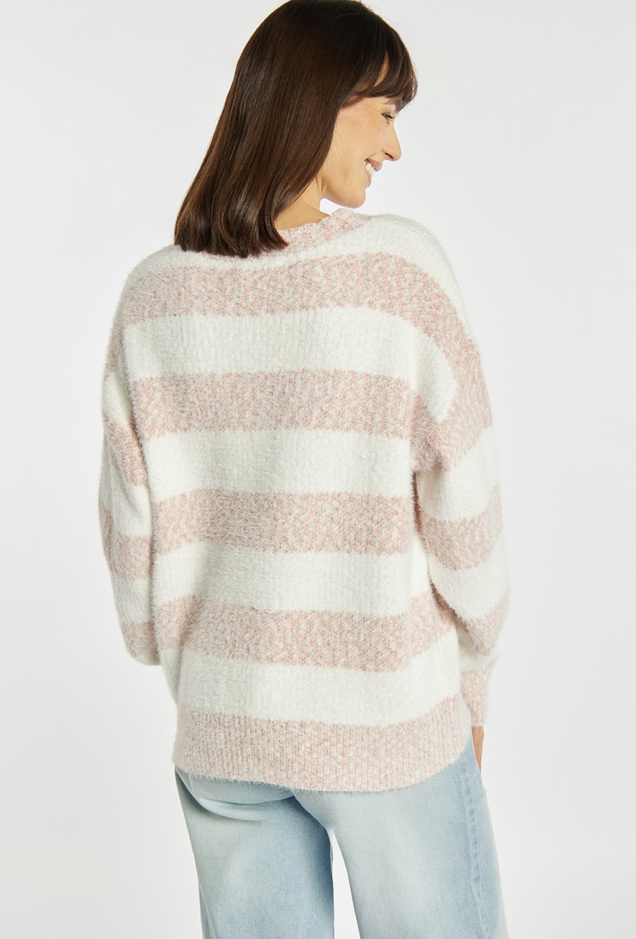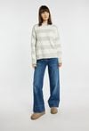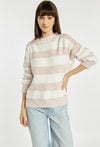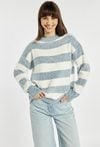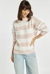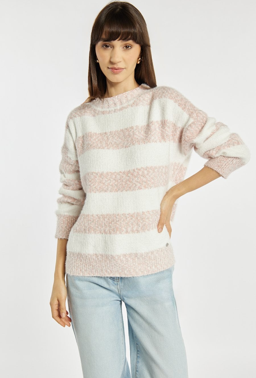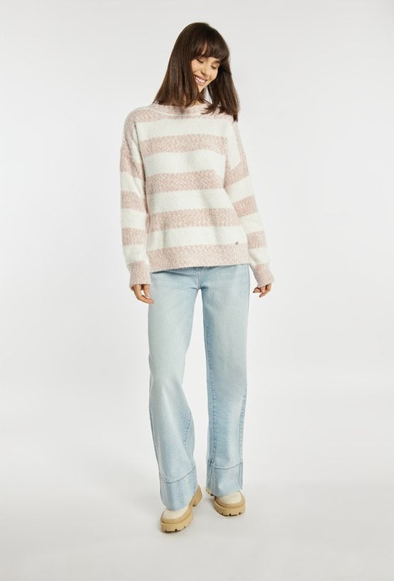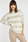 Sweter damski wykonany z przyjemnego w dotyku materiału z krótkim włosiem. Sweter z długimi rękawami i półokrągłym dekoltem wyróżnia się klasycznym, paskowym wzorem, który dodaje stylizacji lekkości i uniwersalnego charakteru. Modelka na zdjęciu ma 177 cm wzrostu i prezentuje rozmiar S/M.