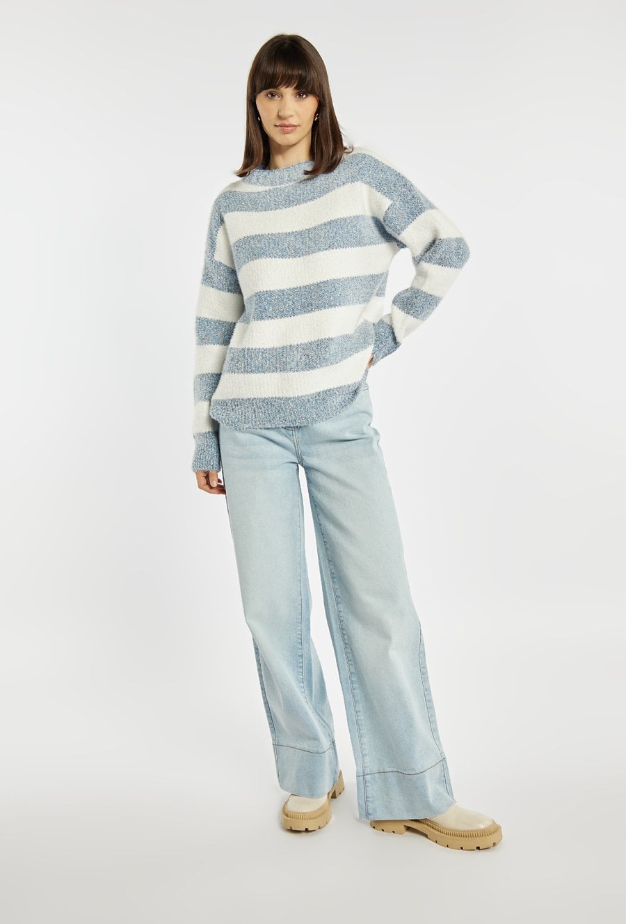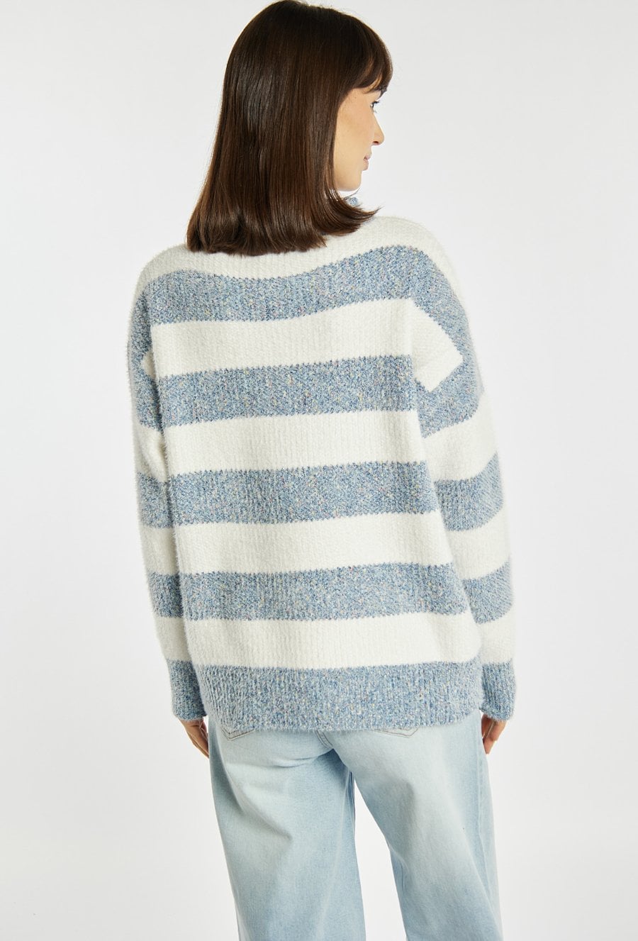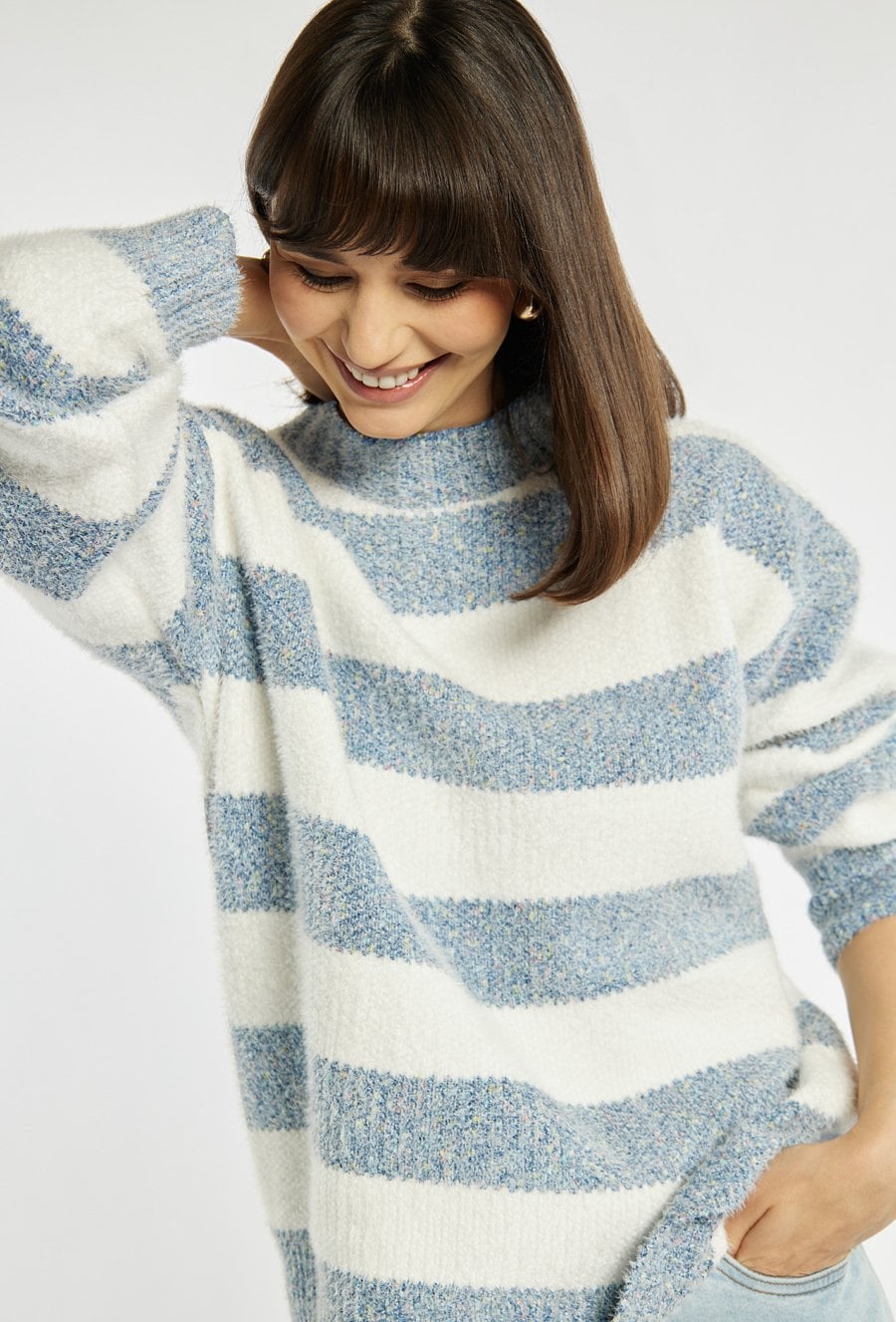 Sweter damski wykonany z przyjemnego w dotyku materiału z krótkim włosiem. Sweter z długimi rękawami i półokrągłym dekoltem wyróżnia się klasycznym, paskowym wzorem, który dodaje stylizacji lekkości i uniwersalnego charakteru. Modelka na zdjęciu ma 177 cm wzrostu i prezentuje rozmiar S/M.