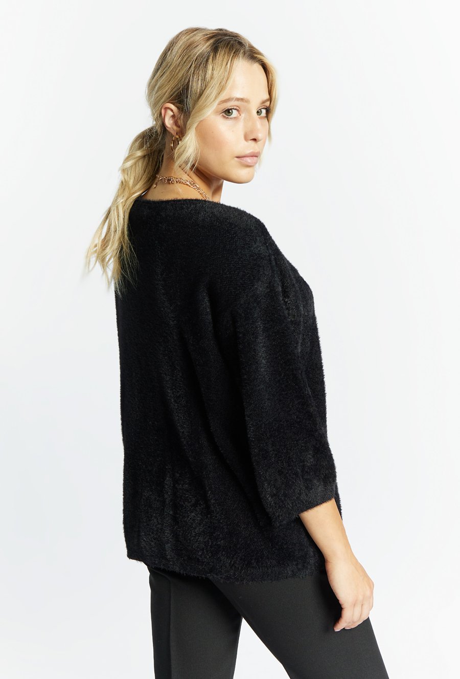 Sweter damski z krótkim włosiem. Sweter z dodatkiem elastycznych włókien, rękawami 3/4 i półokrągłym dekoltem ,Model ten z pewnością sprawdzi się w codziennych jesiennych stylizacjach. Modelka na zdjęciu ma 177 cm wzrostu i prezentuje rozmiar S/M