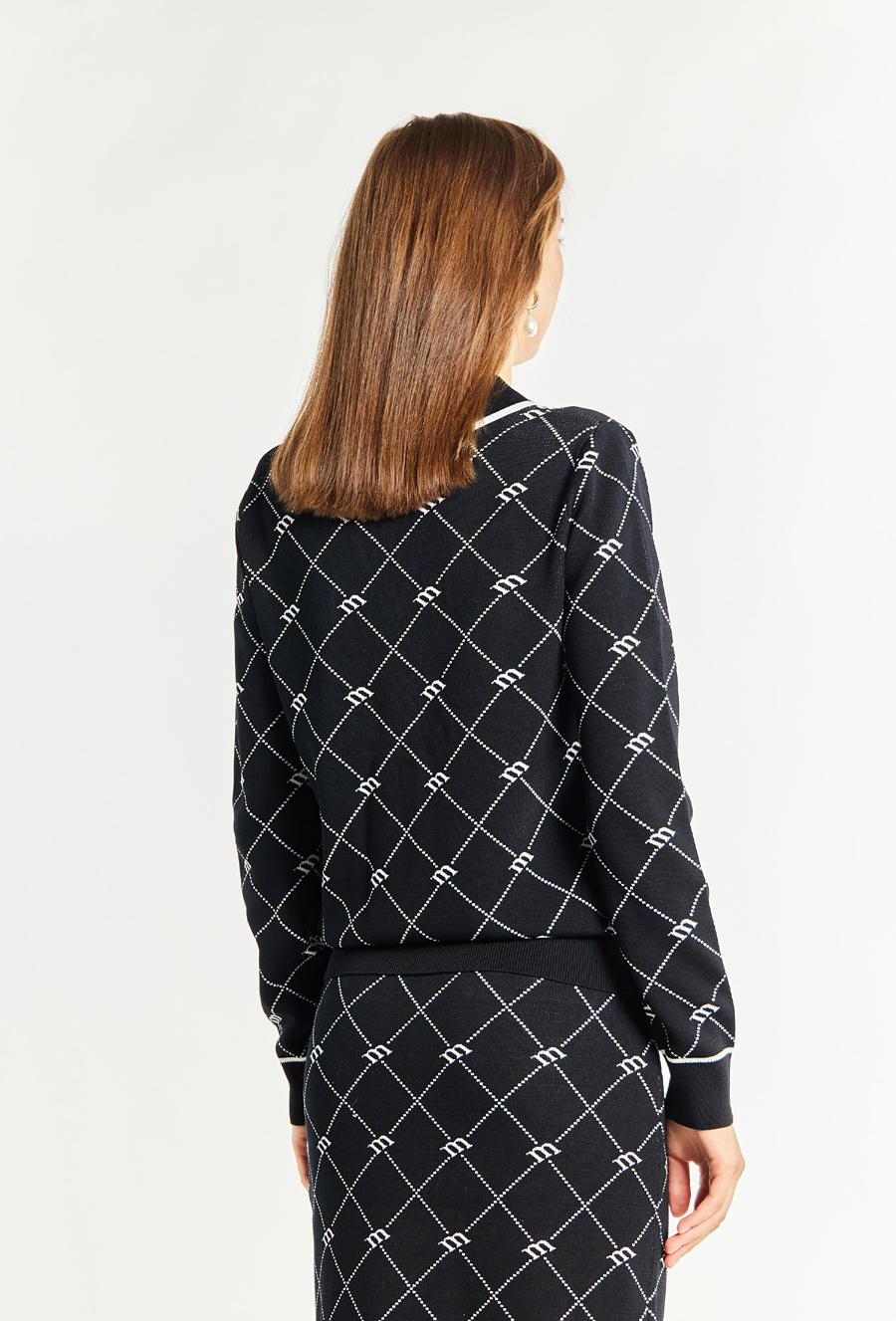 Sweter damski zdobiony charakterystycznym wzorem z logo marki Monnari, który nadaje mu unikalny styl i elegancję. Sweter z długimi rękawami oraz kołnierzem z wycięciem pięknie eksponuje dekolt, tworząc szykowną i wyrafinowaną całość. Model ten polecamy zestawić ze spodniami lub spódnicą z tej samej kolekcji! Kod do spodni: 24Z-TRU2360-K020; kod do spódnicy: 24Z-SKR0950-KM20. Modelka na zdjęciu ma 177 cm wzrostu i prezentuje rozmiar S.