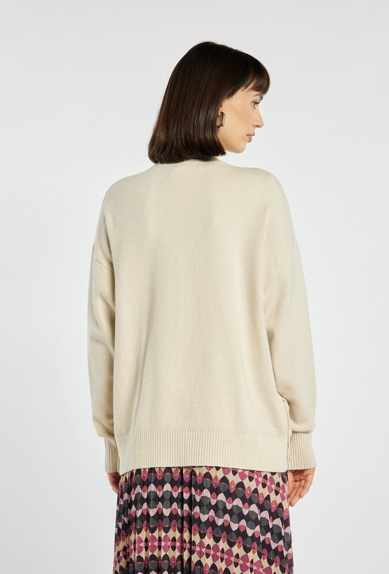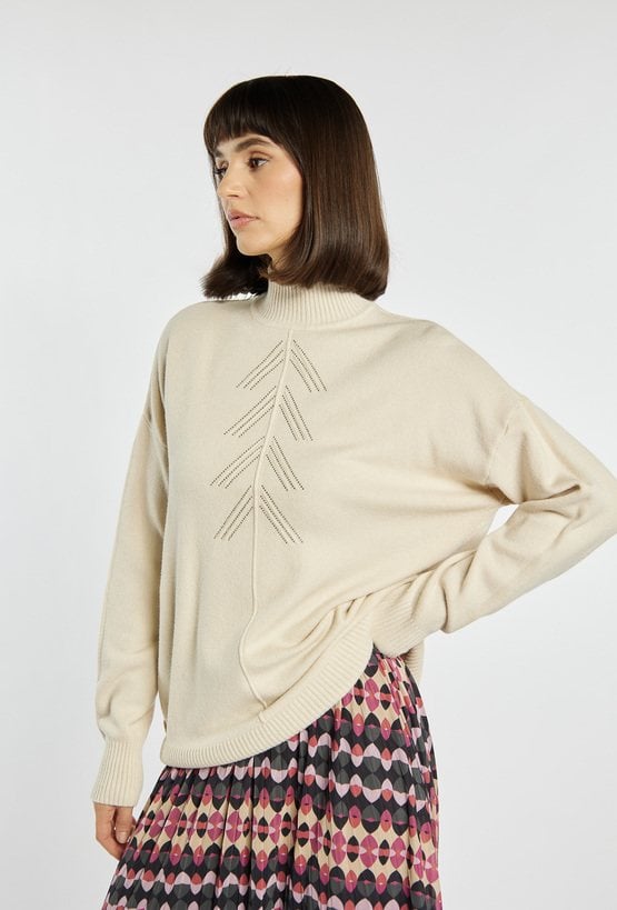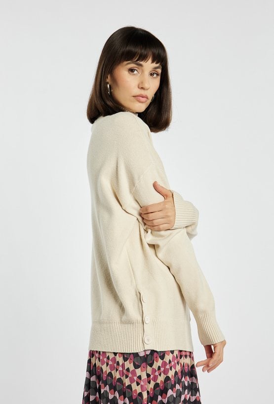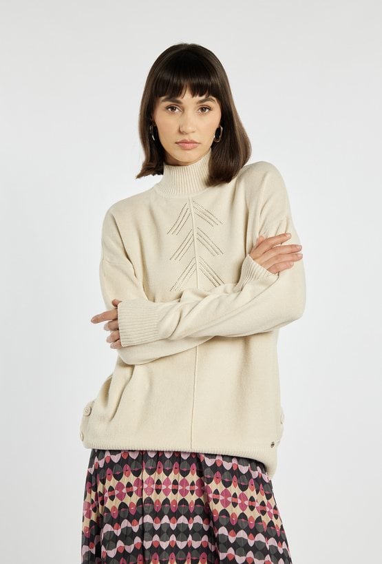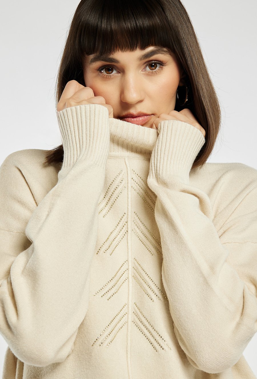 Sweter damski z półgolfem, wykonany z przyjemnego w dotyku materiału (wiskozy). Sweter z długimi rękawami oraz luźniejszym krojem, który nadaje swobodny charakter. Model ten występuje w kilku wariantach kolorystycznych. Modelka na zdjęciu ma 177 cm wzrostu i prezentuje rozmiar S/M.