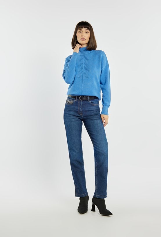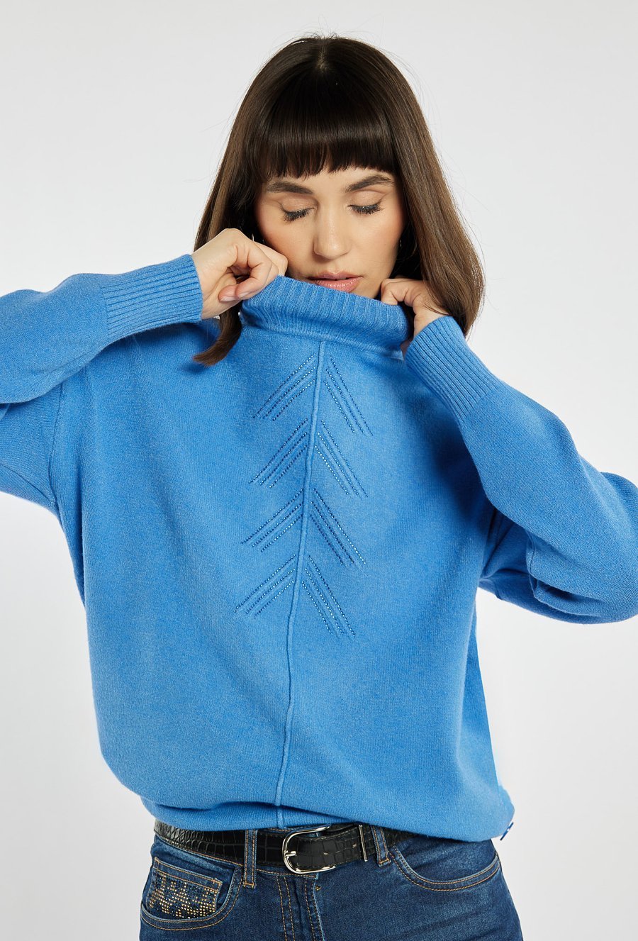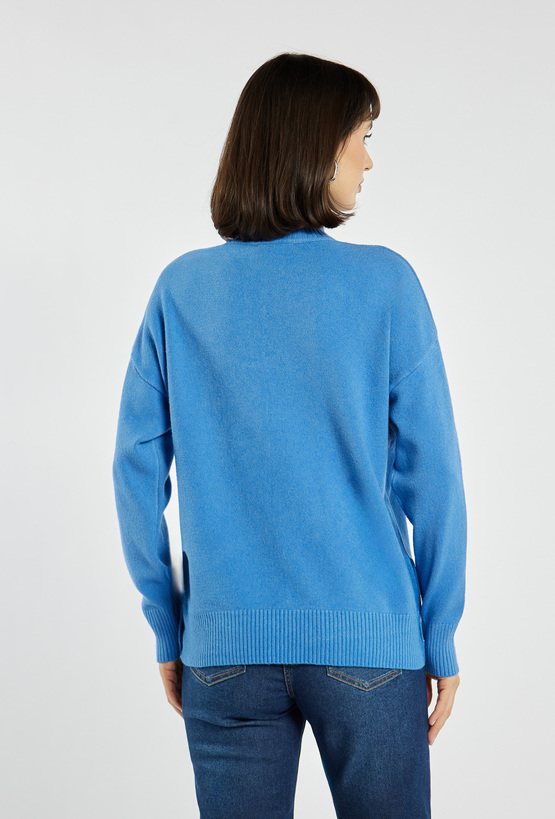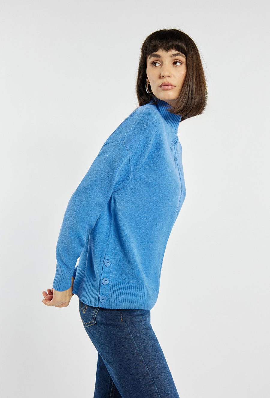 Sweter damski z półgolfem, wykonany z przyjemnego w dotyku materiału (wiskozy). Sweter z długimi rękawami oraz luźniejszym krojem, który nadaje swobodny charakter. Model ten występuje w kilku wariantach kolorystycznych. Modelka na zdjęciu ma 177 cm wzrostu i prezentuje rozmiar S/M.