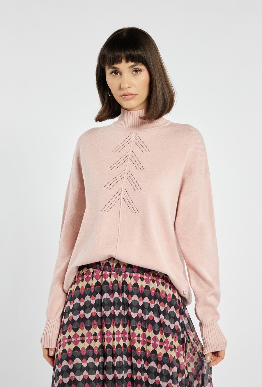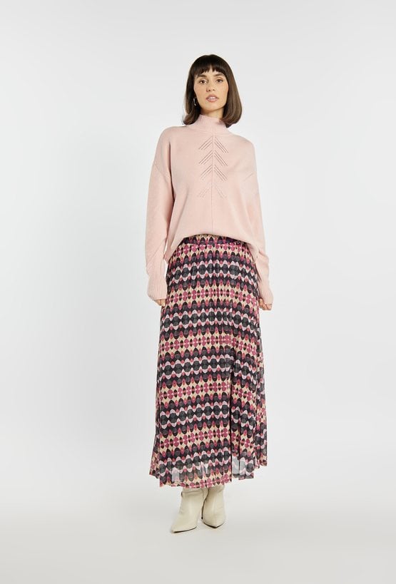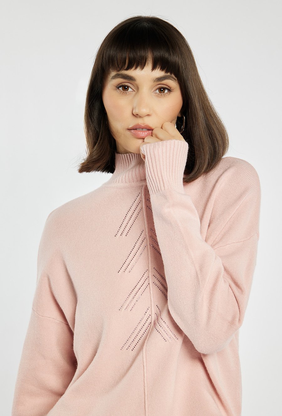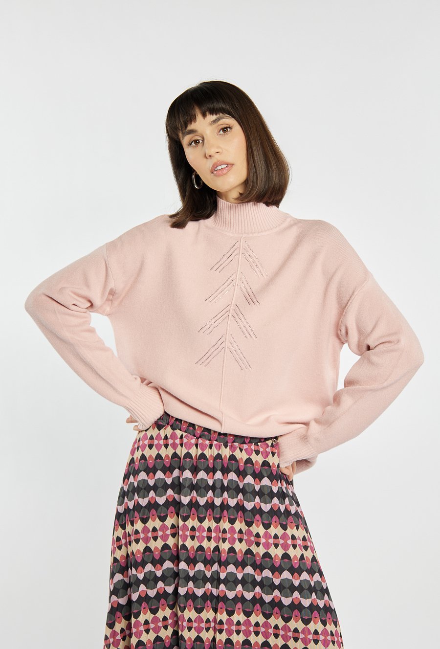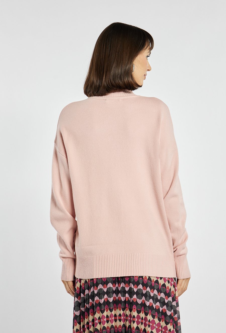 Sweter damski z półgolfem, wykonany z przyjemnego w dotyku materiału (wiskozy). Sweter z długimi rękawami oraz luźniejszym krojem, który nadaje swobodny charakter. Model ten występuje w kilku wariantach kolorystycznych. Modelka na zdjęciu ma 177 cm wzrostu i prezentuje rozmiar S/M.