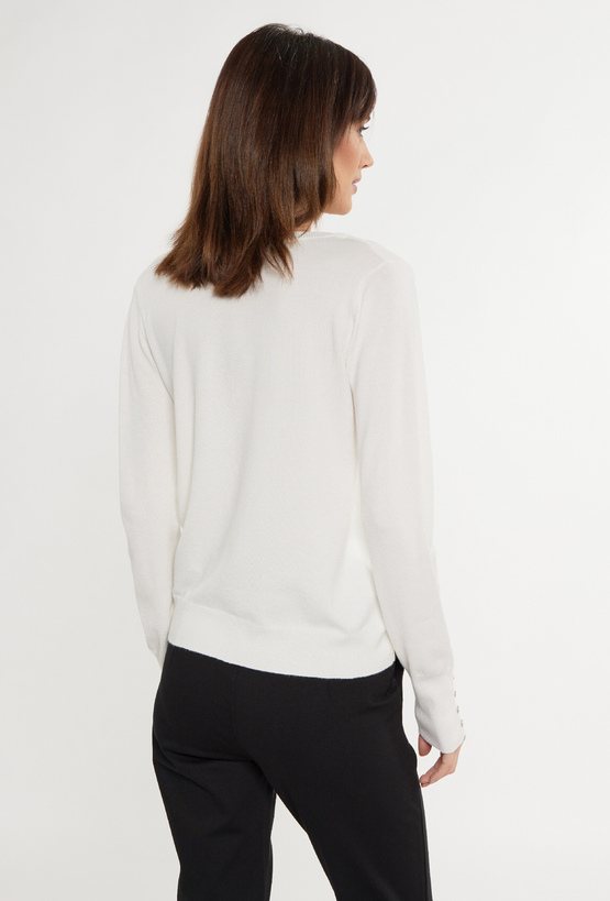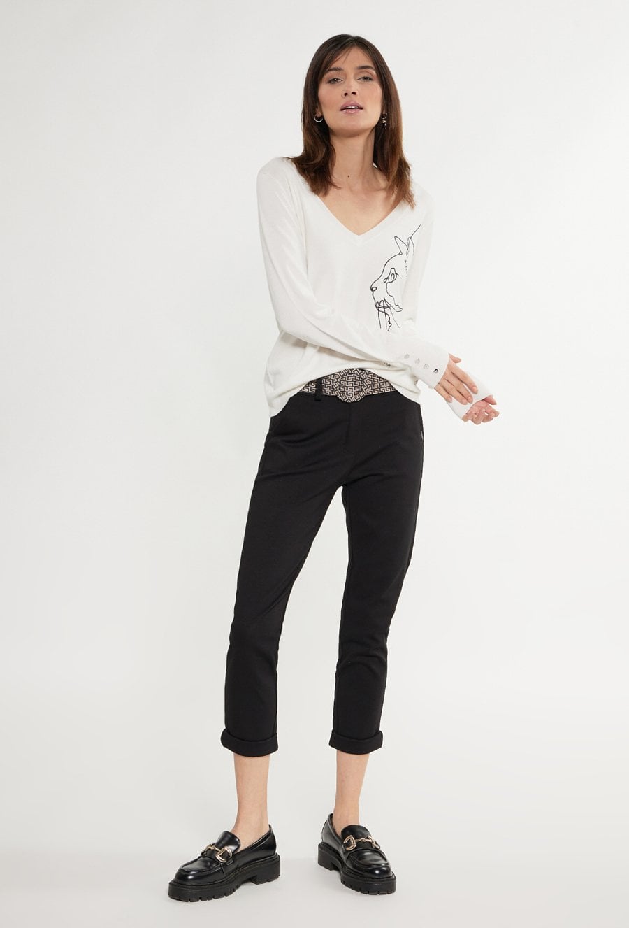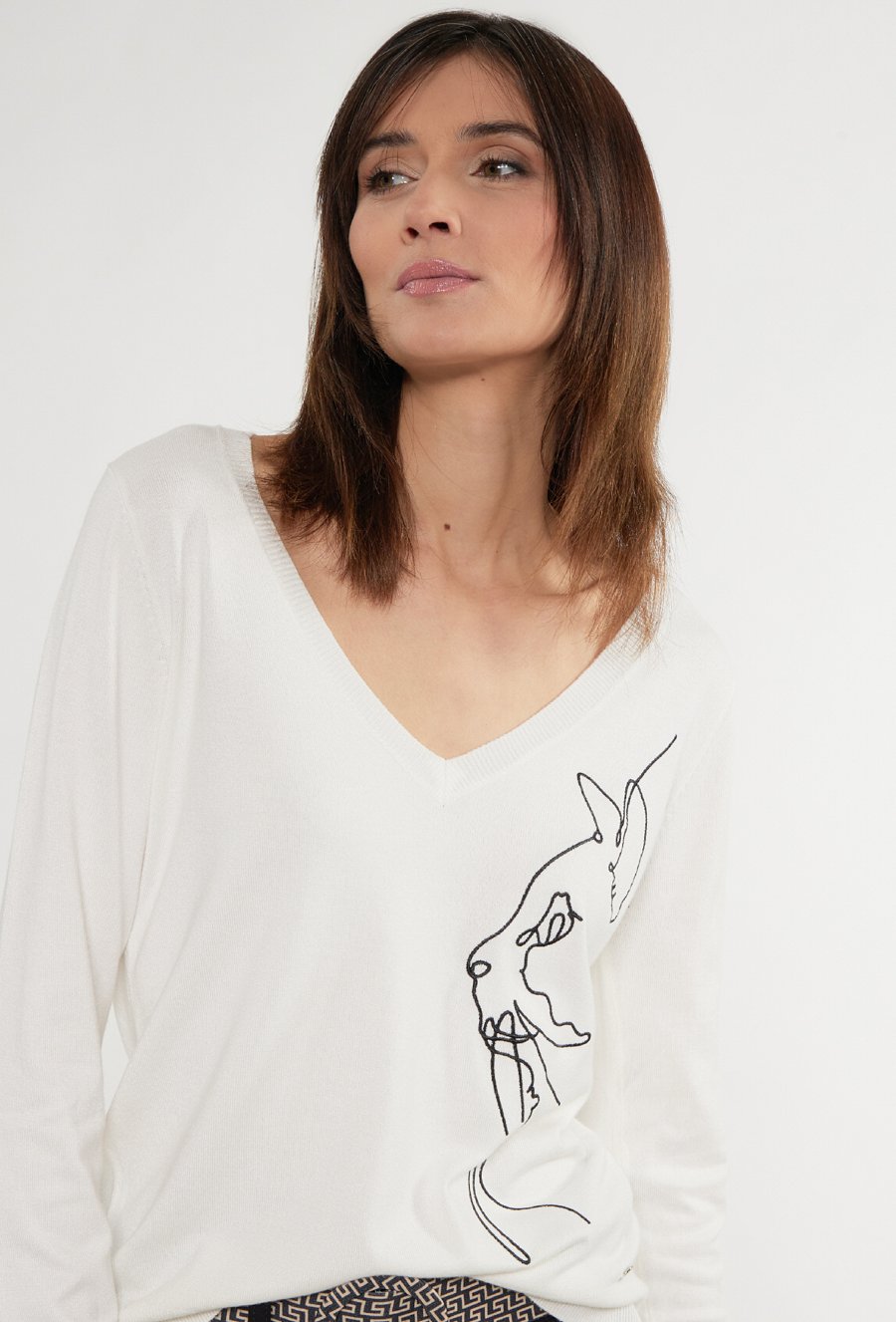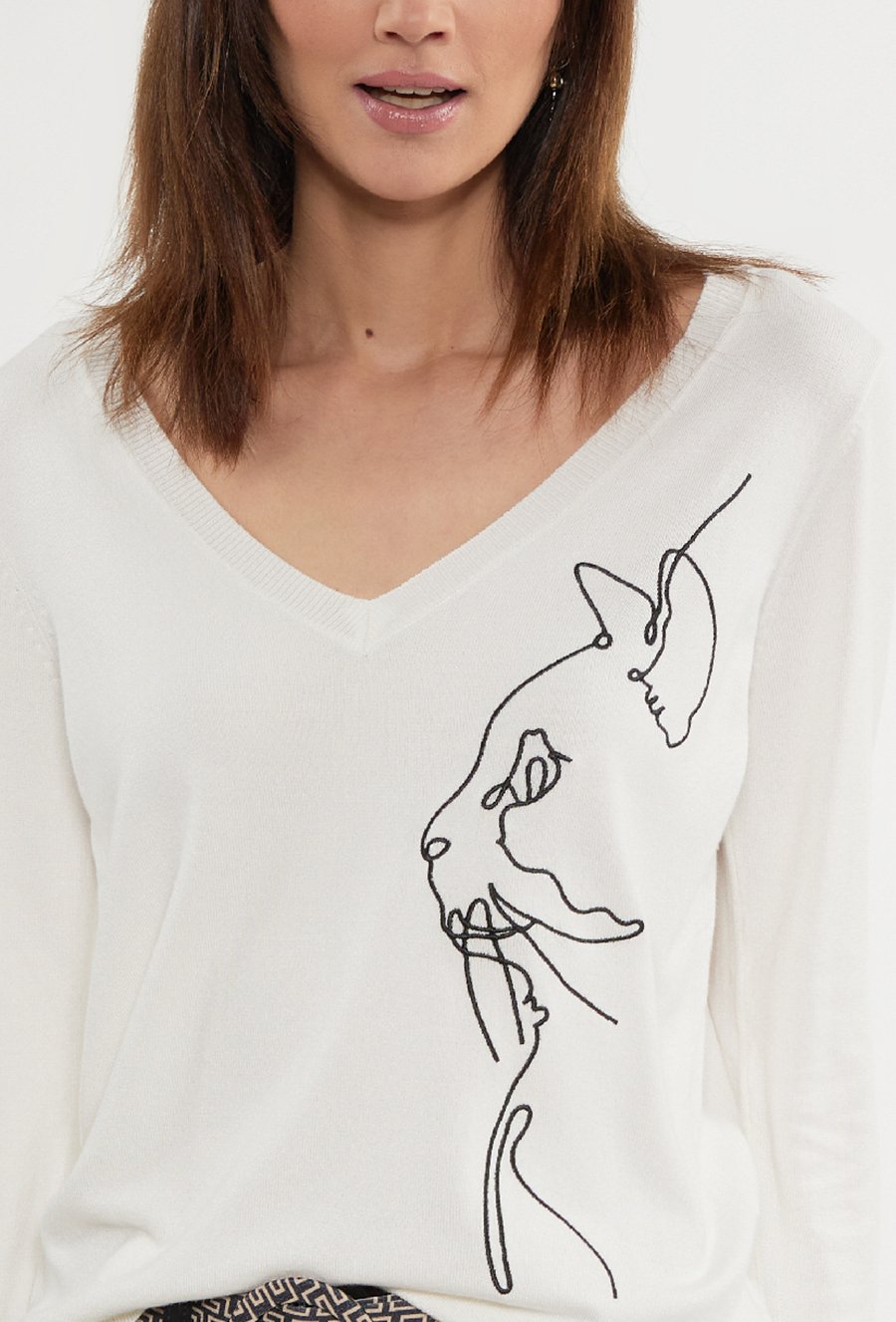Sweter damski z nadrukiem kota. Sweter z długimi rękawami oraz dekoltem w serek. Model ten idealnie sprawdzi się do codziennych stylizacji. Modelka na zdjęciu ma 177cm wzrostu i prezentuje rozmiar 36.