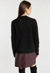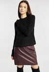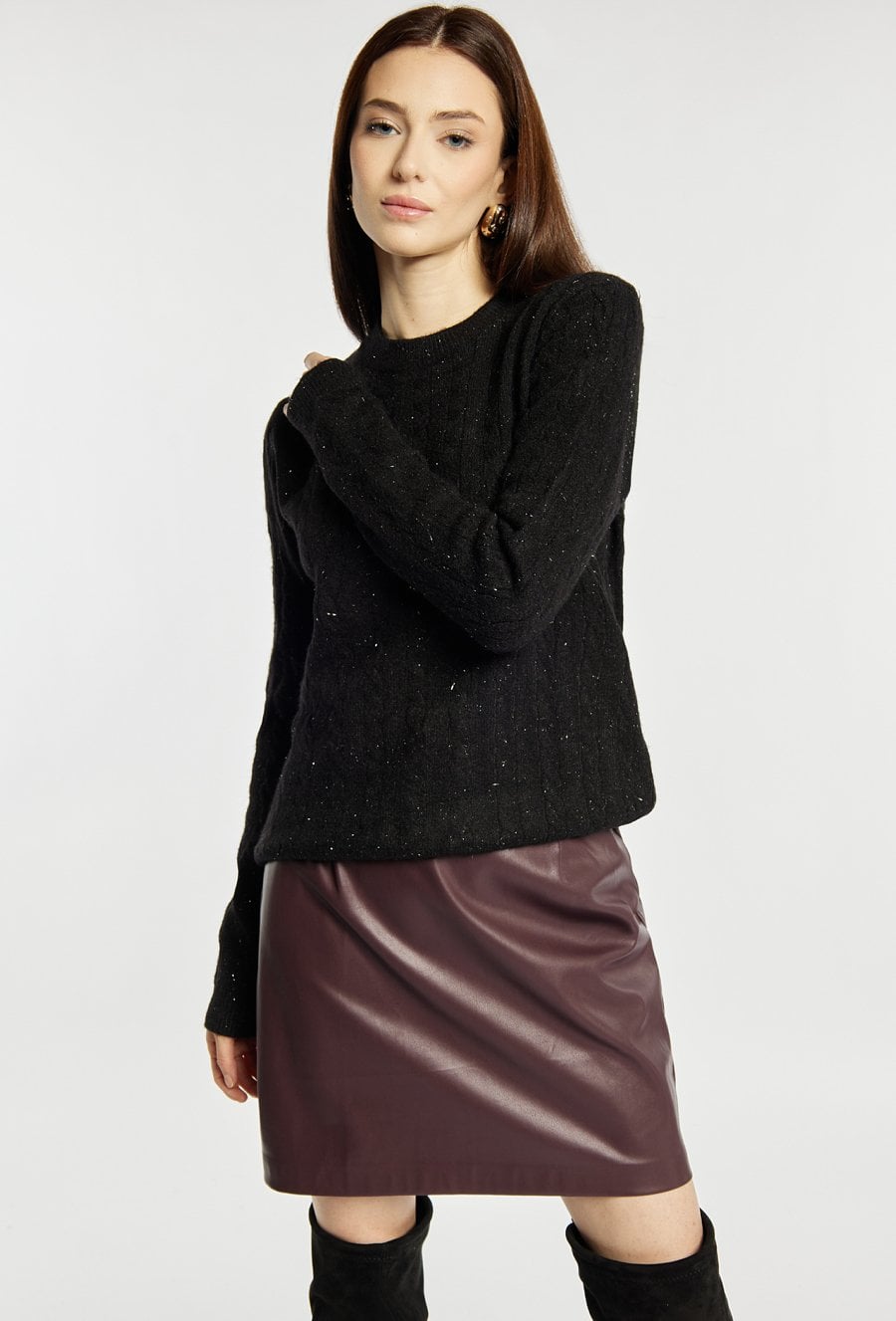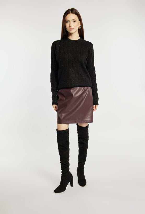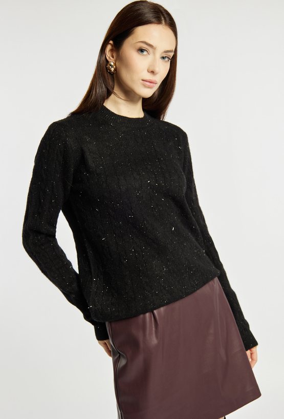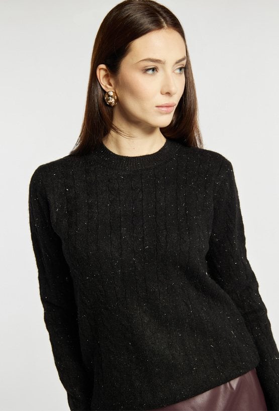 Sweter damski z delikatnym splotem, o klasycznym fasonie. Model z długimi rękawami i półokrągłym dekoltem. Dodatkowym atutem jest subtelny połysk, dzięki któremu sweter doskonale uzupełni świąteczne i eleganckie stylizacje. Modelka na zdjęciu ma 177 cm wzrostu i prezentuje rozmiar S/M.