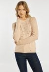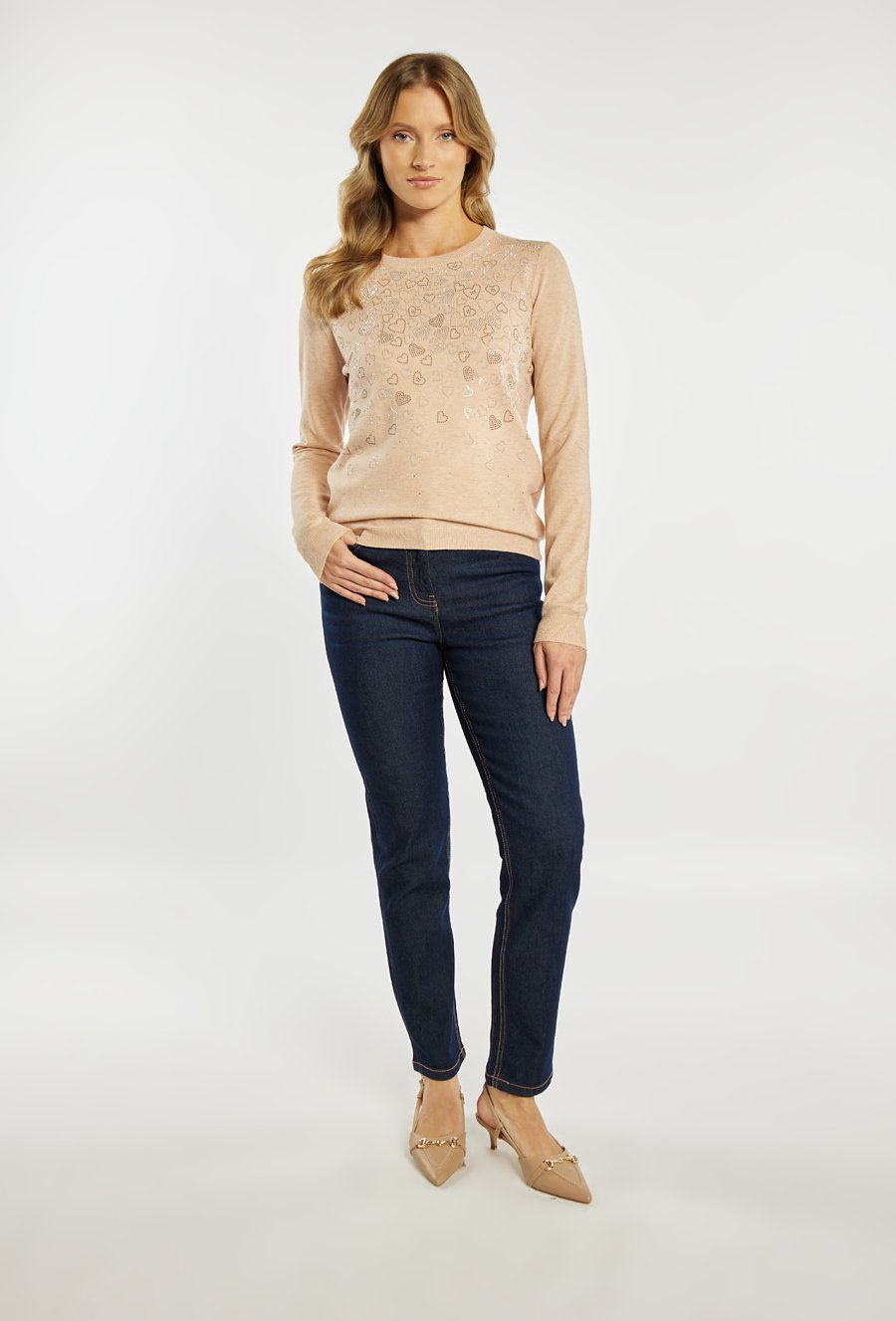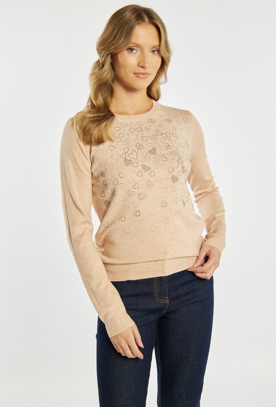 Sweter damski o klasycznym, dopasowanym kroju. Model z długim rękawem oraz półokrągłym dekoltem. Przód zdobi subtelna aplikacja w kształcie serc z delikatnie połyskującymi elementami, która nadaje całości kobiecego i eleganckiego charakteru. Sweter doskonale sprawdzi się w codziennych oraz bardziej stylowych zestawach. Modelka na zdjęciu ma 177 cm wzrostu i prezentuje rozmiar S/M.