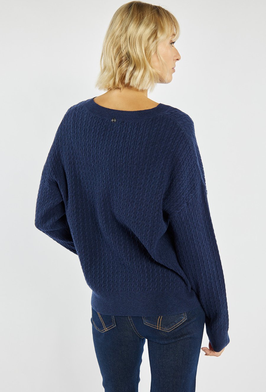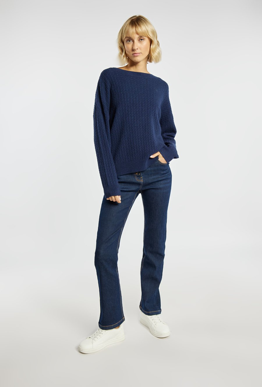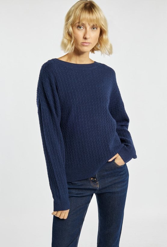 Sweter damski z dodatkiem wełny. Sweter o warkoczowym splocie i klasycznym fasonie z okrągłym dekoltem. Model w granatowym kolorze doskonale sprawdzi się w jesienno-zimowych stylizacjach. Modelka na zdjęciu ma 177 cm wzrostu i prezentuje rozmiar S.