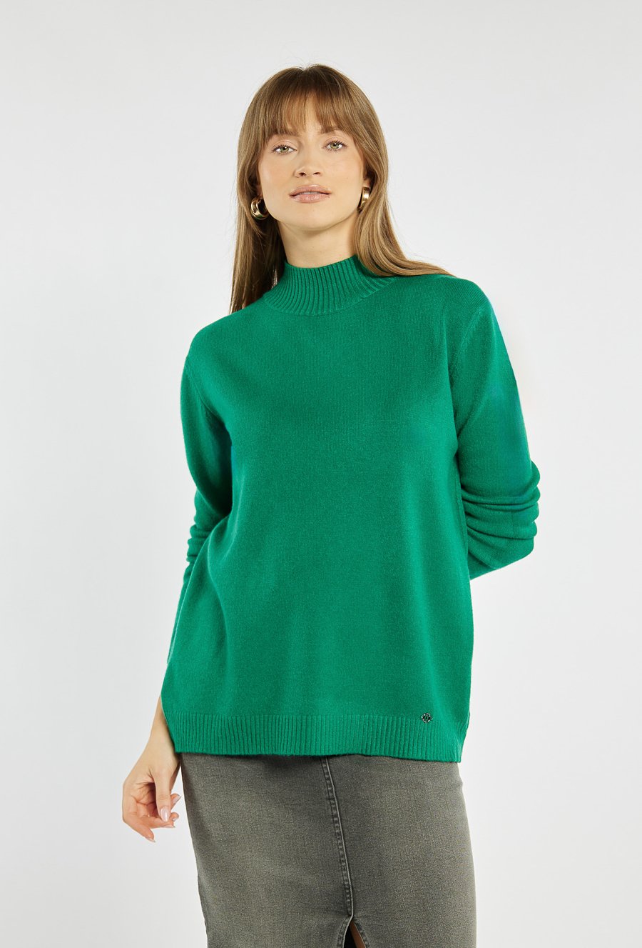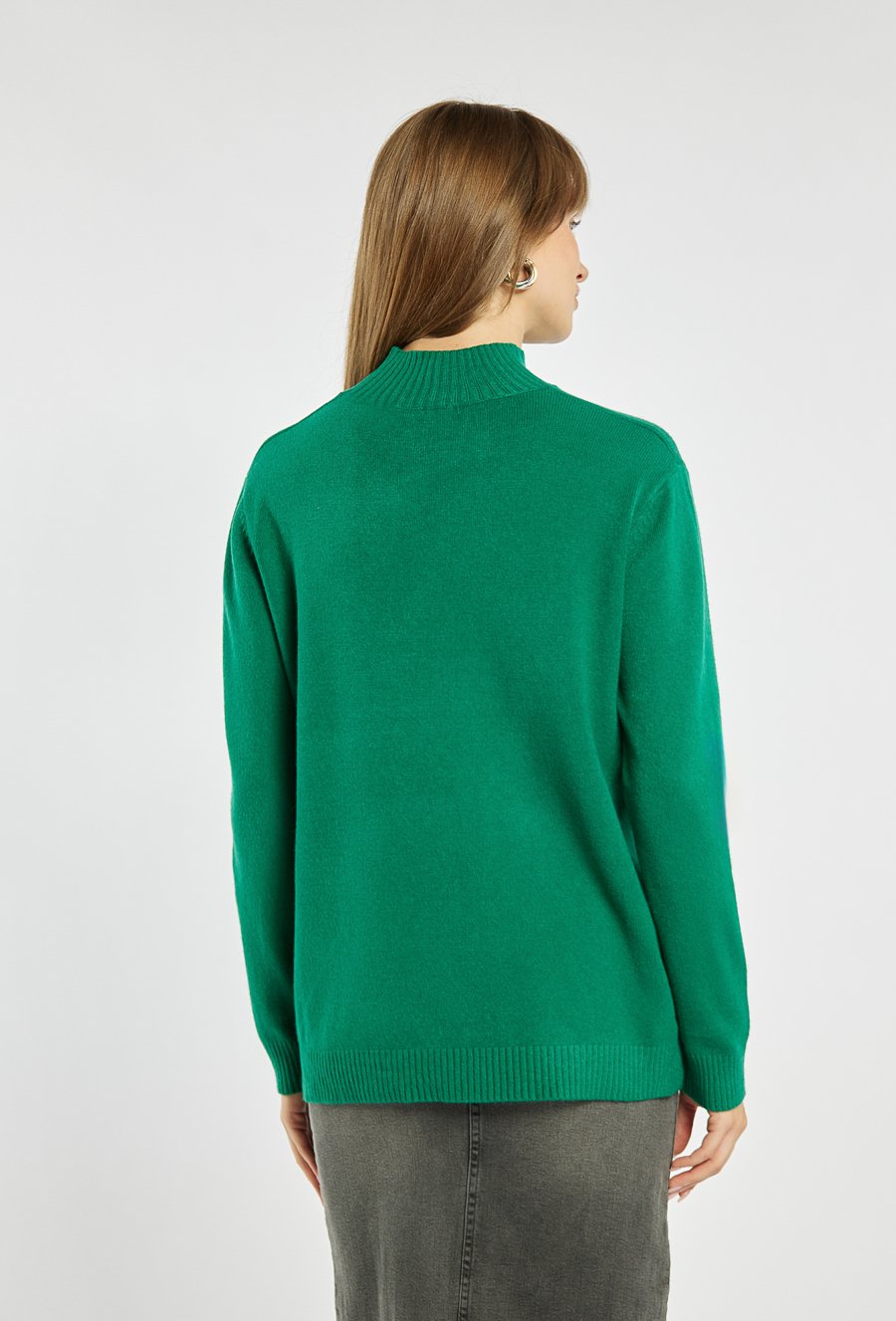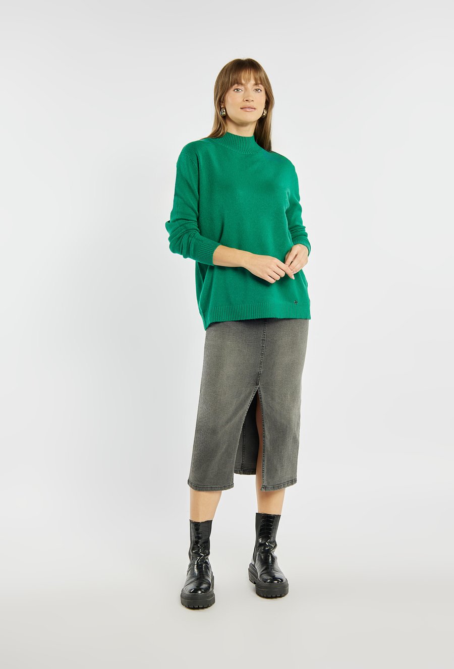 Sweter o prostym, klasycznym kroju i delikatnie podniesionym dekolcie to miękka i komfortowa propozycja na co dzień. Sweter dostępny jest również w innych wariantach kolorystycznych, dzięki czemu łatwo dopasujesz go do własnego stylu. Modelka na zdjęciu ma 177 cm wzrostu i prezentuje rozmiar S/M.