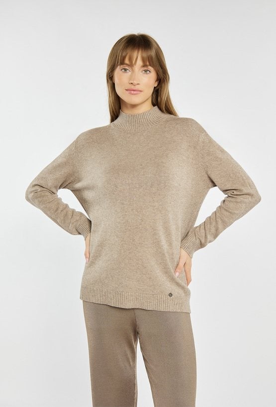 Sweter o prostym, klasycznym kroju i delikatnie podniesionym dekolcie to miękka i komfortowa propozycja na co dzień. Sweter dostępny jest również w innych wariantach kolorystycznych, dzięki czemu łatwo dopasujesz go do własnego stylu. Modelka na zdjęciu ma 177 cm wzrostu i prezentuje rozmiar S/M.