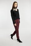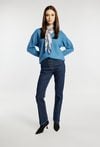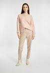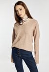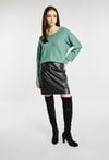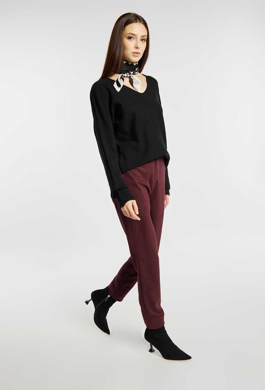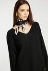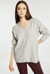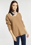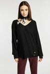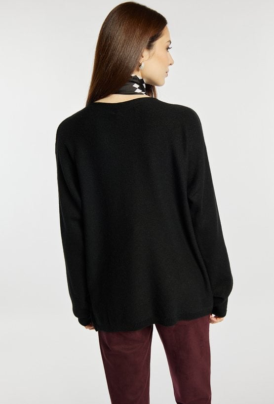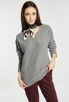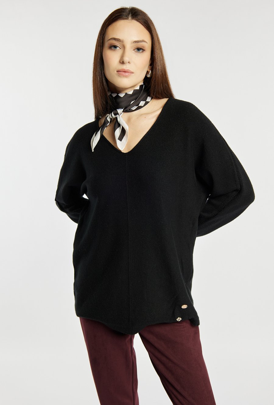 Sweter z długimi rękawami i dekoltem w serek to miękki, lekki i bardzo komfortowy model idealny na co dzień. Sweter ma prosty, lekko wydłużony fason, dekoracyjne przeszycie z przodu oraz delikatne złote aplikacje przy dole dla subtelnej elegancji. Modelka na zdjęciu ma 177 cm wzrostu i prezentuje rozmiar S/M.