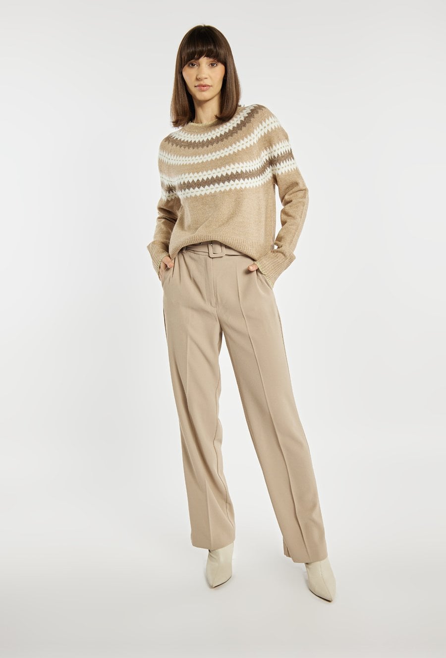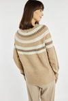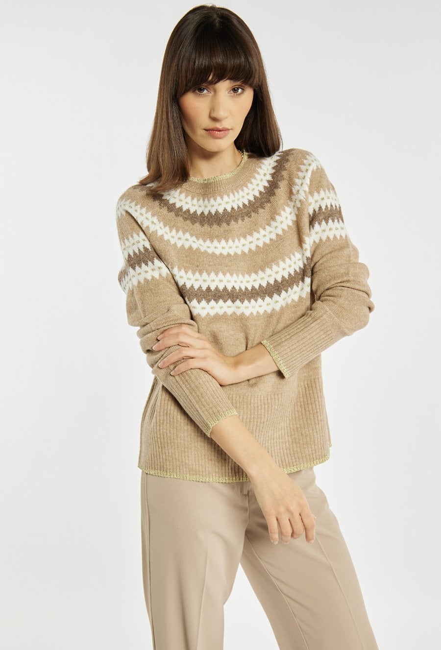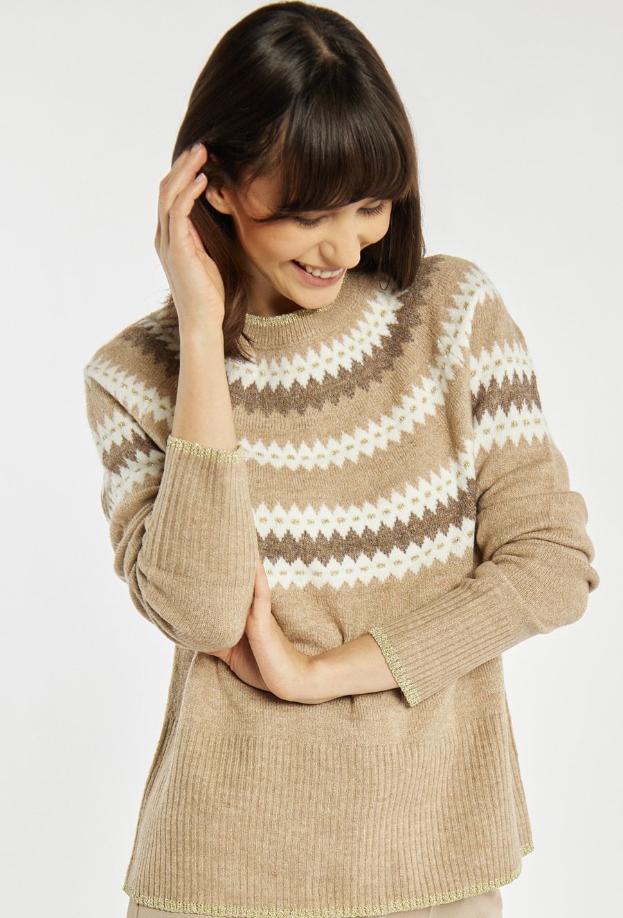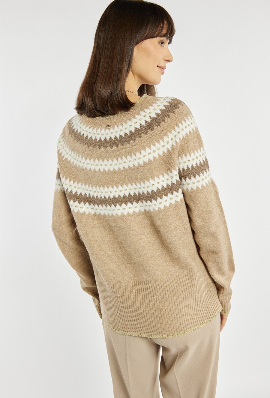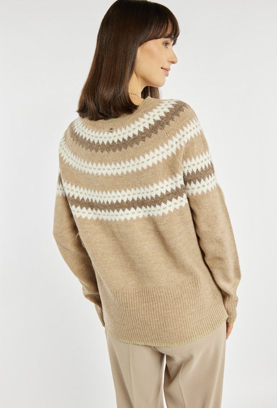 Sweter damski o klasycznym kroju, ozdobiony geometrycznym wzorem w górnej części. Luźniejszy fason zapewnia komfort noszenia. Sweter doskonale sprawdzi się w chłodniejsze dni. Idealny wybór na co dzień. Modelka na zdjęciu ma 177 cm wzrostu i prezentuje rozmiar S.