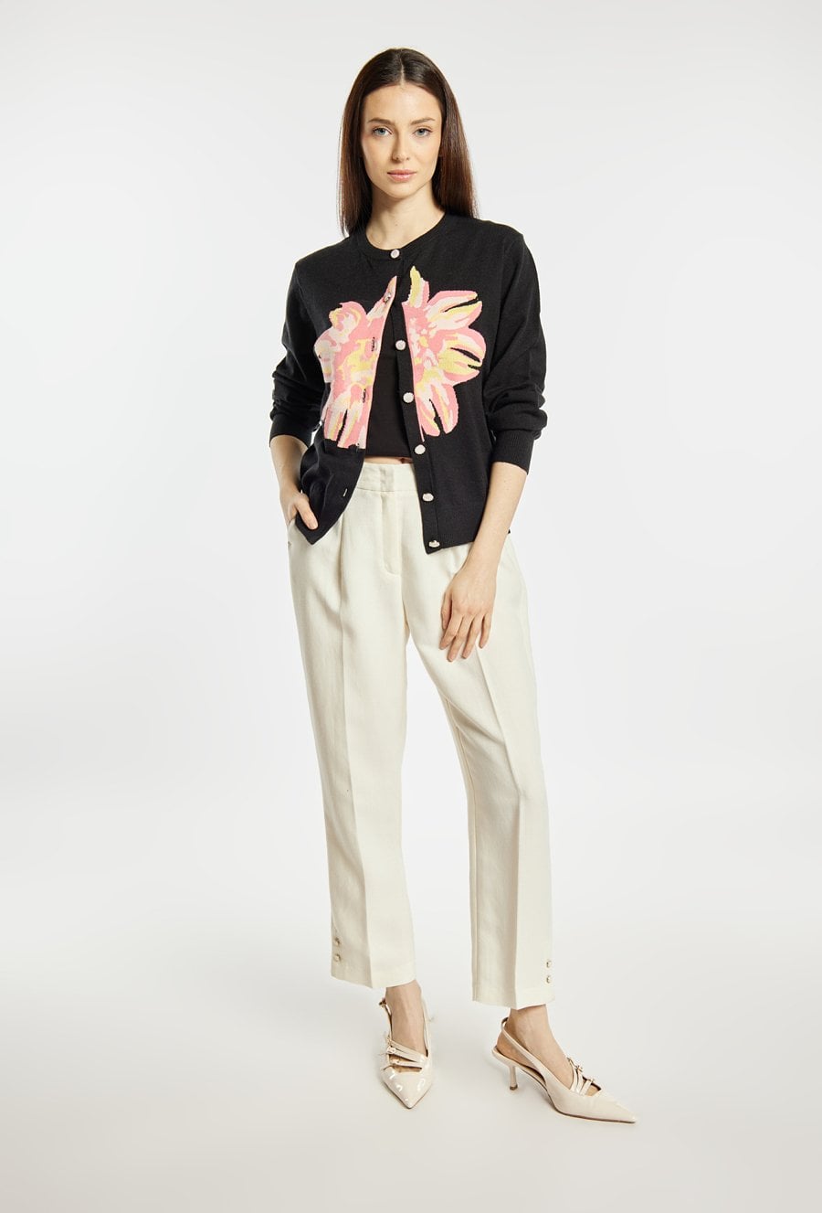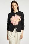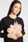 Sweter damski o klasycznym, wygodnym kroju. Model z długim rękawem oraz półokrągłym dekoltem, zapinany na guziki. Przód zdobi efektowny, kwiatowy wzór, który nadaje całości wyrazistego i kobiecego charakteru. Damski sweter doskonale sprawdzi się w codziennych oraz bardziej stylowych stylizacjach. Modelka na zdjęciu ma 177 cm wzrostu i prezentuje rozmiar S/M.