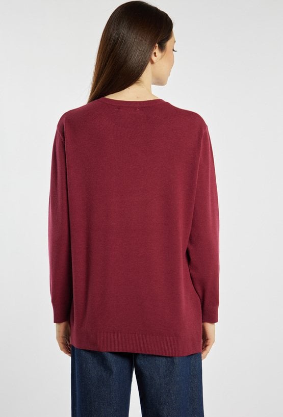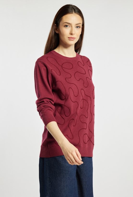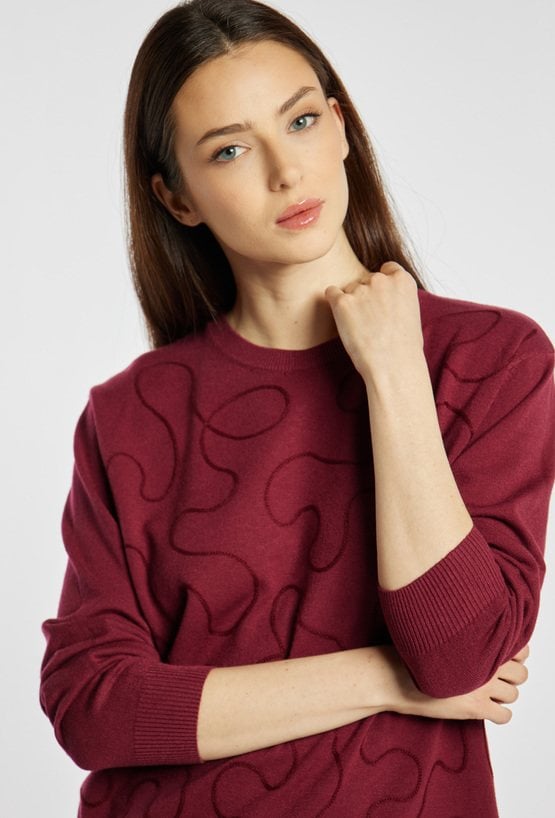 Sweter damski o klasycznym, wygodnym kroju. Model z długim rękawem oraz półokrągłym dekoltem. Przód zdobi efektowny, kontrastowy wzór. Damski sweter we wzory doskonale sprawdzi się w codziennych oraz bardziej stylowych stylizacjach. Modelka na zdjęciu ma 177 cm wzrostu i prezentuje rozmiar S/M.