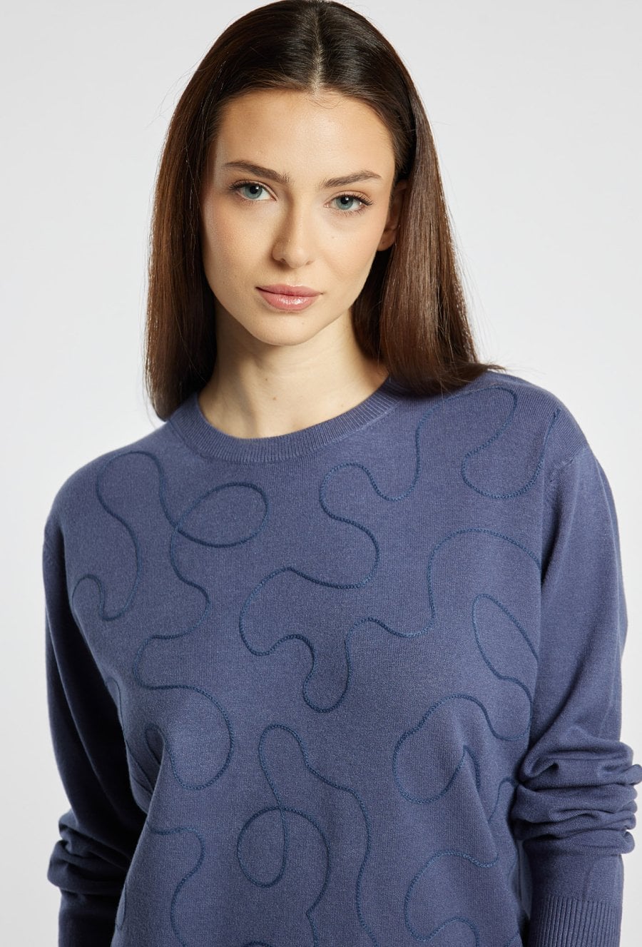Sweter damski o klasycznym, wygodnym kroju. Model z długim rękawem oraz półokrągłym dekoltem. Przód zdobi efektowny, kontrastowy wzór. Damski sweter we wzory doskonale sprawdzi się w codziennych oraz bardziej stylowych stylizacjach. Modelka na zdjęciu ma 177 cm wzrostu i prezentuje rozmiar S/M.