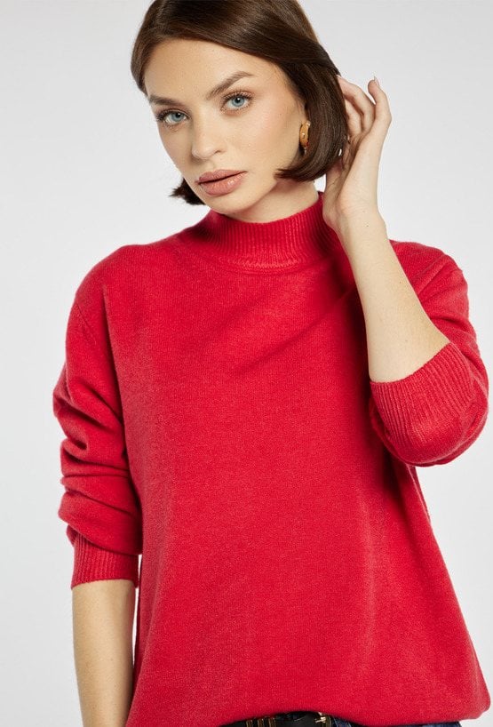 Sweter damski o prostym i klasycznym kroju. Sweter z długimi rękawami oraz półgolfem. Idealny do eleganckich, jak i codziennych stylizacji, dodaje subtelnej kobiecości i lekkości. Sweter występuje w kilku wariantach kolorystycznych. Modelka na zdjęciu ma 177 cm wzrostu i prezentuje rozmiar S/M.