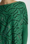 Sweter damski o swobodnym kroju z wzorem w litery oraz z cekinami. Sweter wykonany z przyjemnego w dotyku materiału z półokrągłym dekoltem oraz długimi rękawami. Model ten występuje w wielu wariantach kolorystycznych i świetnie sprawdzi się na co dzień. Modelka na zdjęciu ma 177 cm wzrostu i prezentuje rozmiar 36.