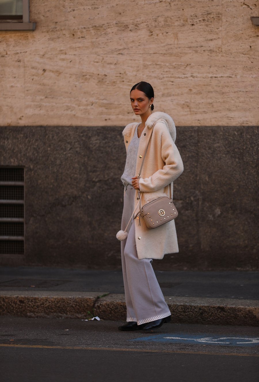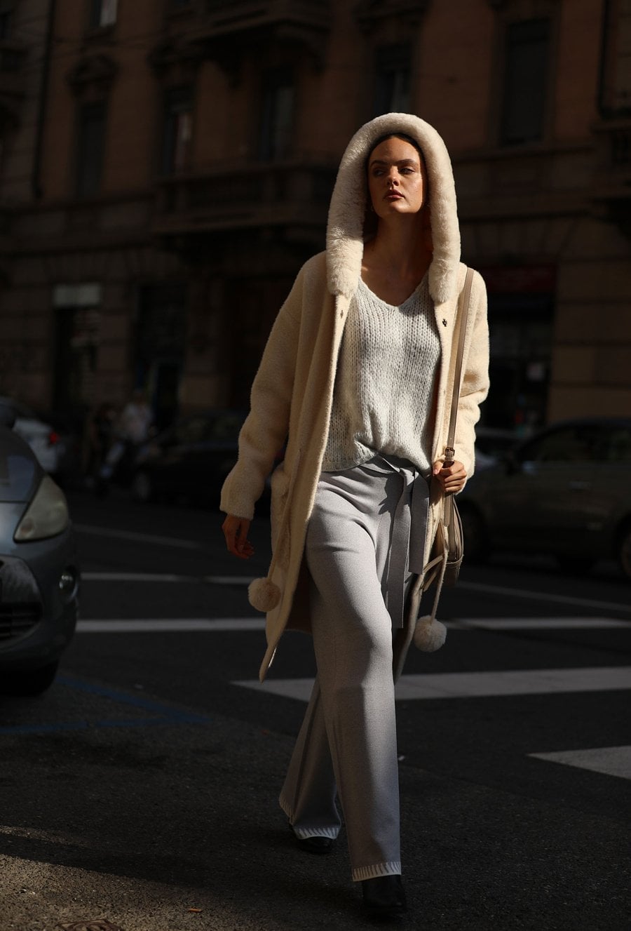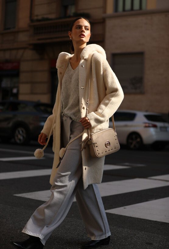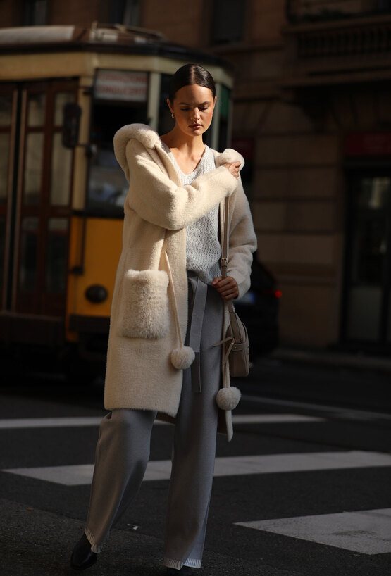 Sweter damski o kroju płaszczowym z praktycznym kapturem. Model przewiązywany w pasie paskiem z dekoracyjnymi pomponami, które dodają całości lekkiego, kobiecego charakteru. Z przodu duże kieszenie wykończone futrzanym detalem podkreślają przytulny i modny styl. Idealny wybór na chłodniejsze dni, sprawdzi się zarówno w casualowych, jak i bardziej eleganckich zestawach. Modelka na zdjęciu ma 177 cm wzrostu i prezentuje rozmiar S