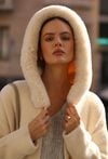 Sweter damski o kroju płaszczowym z praktycznym kapturem. Model przewiązywany w pasie paskiem z dekoracyjnymi pomponami, które dodają całości lekkiego, kobiecego charakteru. Z przodu duże kieszenie wykończone futrzanym detalem podkreślają przytulny i modny styl. Idealny wybór na chłodniejsze dni, sprawdzi się zarówno w casualowych, jak i bardziej eleganckich zestawach. Modelka na zdjęciu ma 177 cm wzrostu i prezentuje rozmiar S