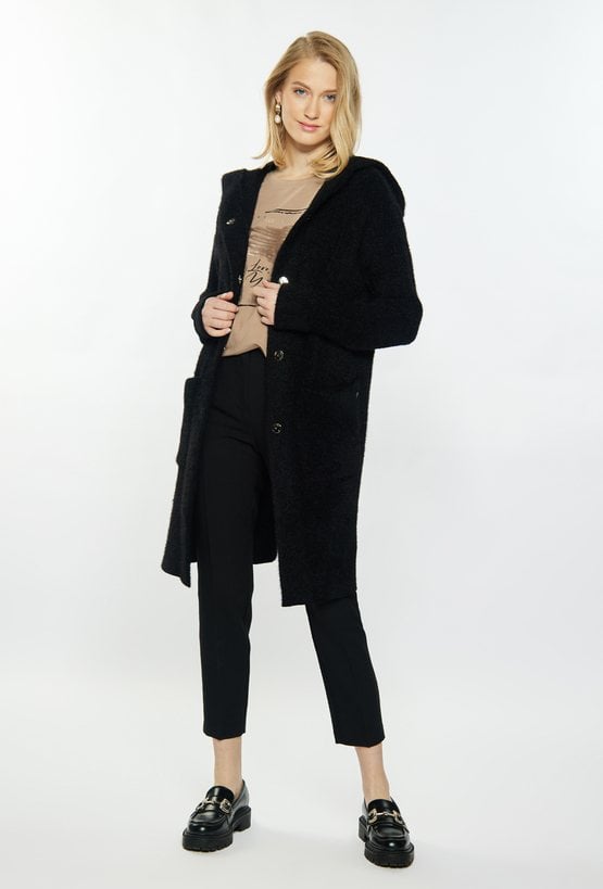 Sweter płaszczowy z włosiem wykonany z przyjemnego w dotyku materiału. Sweter z podwiniętymi, długimi rękawami oraz kapturem. Na linii bioder wpuszczane kieszenie. Sweter zapinany na napy. Model ten idealnie sprawdzi się na chłodne dni. Modelka na zdjęciu ma 177 cm wzrostu i prezentuje rozmiar S.