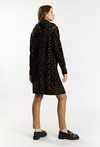 Sweter płaszczowy damski z wzorem oraz włosiem. Sweter z kapturem, długimi, podwiniętymi rękawami oraz z wpuszczonymi na linii bioder kieszeniami. Sweter zapinany na napy. Model ten idealnie sprawdzi się na chłodne dni. Modelka na zdjęciu ma 177 cm wzrostu i prezentuje rozmiar 36.